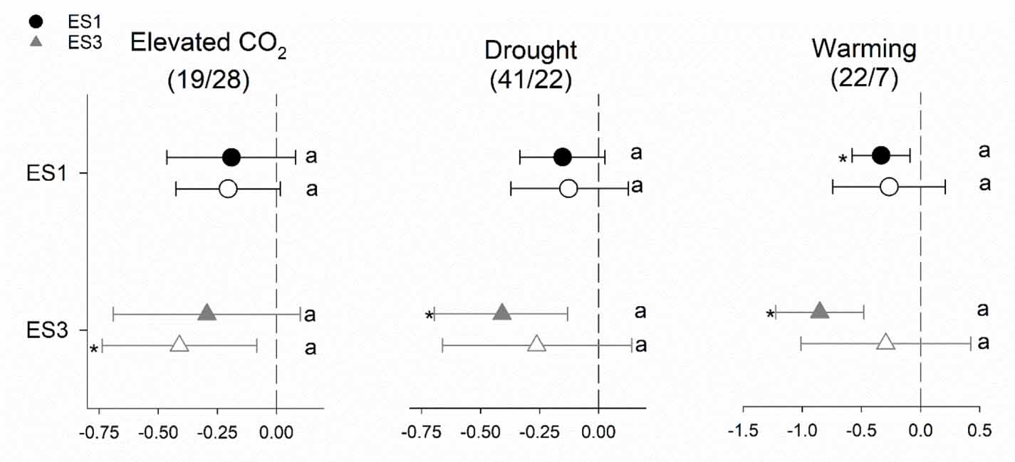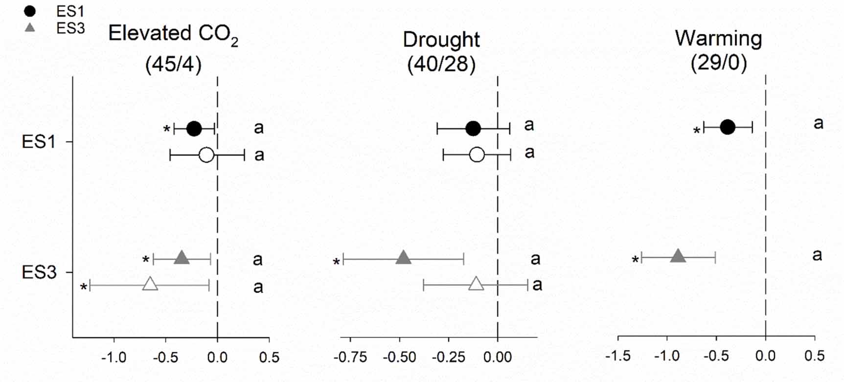 Figure 6. Effect size (ES) estimates of weeds under current environmental (ES1) vs. weeds with environmental change (ES3) for studies with single weed species (solid symbols) vs. multiple weeds (white symbols). Credible intervals (95%) that do not include zero are considered statistically significant (indicated by an asterisk). Within each panel, different letters indicate that the effects are statistically different from each other (credible intervals do not overlap). Numbers indicate sample sizes (single/multiple). See table S2 for parameter values.