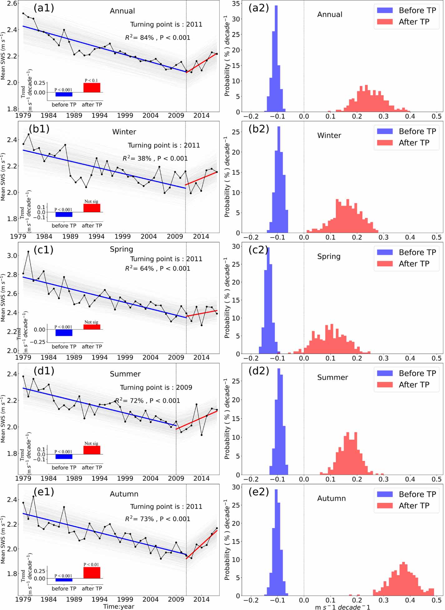 Figure 1. (a1)–(e1) Temporal changes of mean annual and seasonal SWSs from 1979 to 2017 (unit: m s−1); (a2)–(e2) frequency distributions of the trends in mean annual and seasonal SWSs before and after the TPs identified in the 300 resampling results (unit: %). Each gray line (n = 300) is a piecewise linear fit for a randomly selected 30% subset of all stations. Blue and red lines are the piecewise linear fits. The trends during the two periods are presented in the inset. R2 is the goodness-of-fit. The closer the R2 is to 100%, the better the fitting effect. P < 0.1, 0.01, and 0.001 indicate the 90%, 99%, and 99.9% t-test confidence levels, respectively. Not sig indicates that the trend failed to pass the 90% significance t-test.