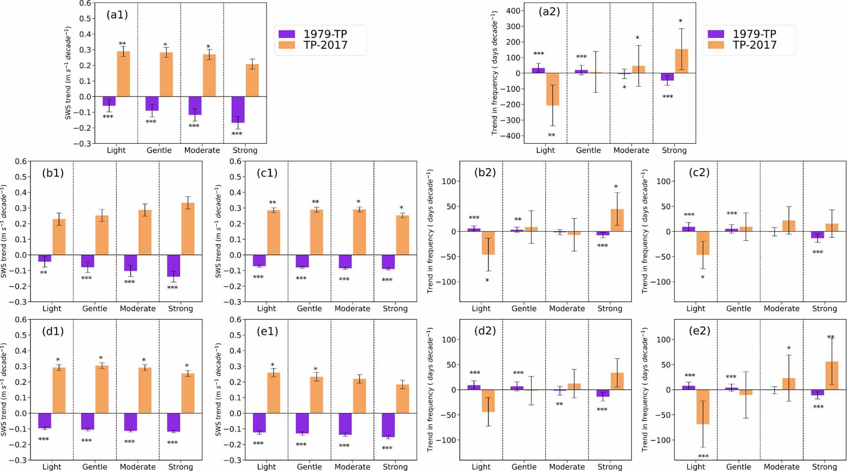Figure 3. Linear trends of different wind categories (light, gentle, moderate, and strong) (unit: m s−1 decade−1), and linear trends of annual and seasonal frequencies of different wind categories (unit: days decade−1) for 1979–TP and TP–2017, respectively. 1 and 2 denote the linear trends of speeds and frequencies, respectively. (a)–(e) denote annual mean, winter, spring, summer, and autumn, respectively. The significances of the trends are as follows: *, **, and *** denote the trends passing the significance t-test at the 0.10, 0.01, and 0.001 levels, respectively. Blank indicates a trend is not significant. Black bars denote the uncertainties of the estimation results.
