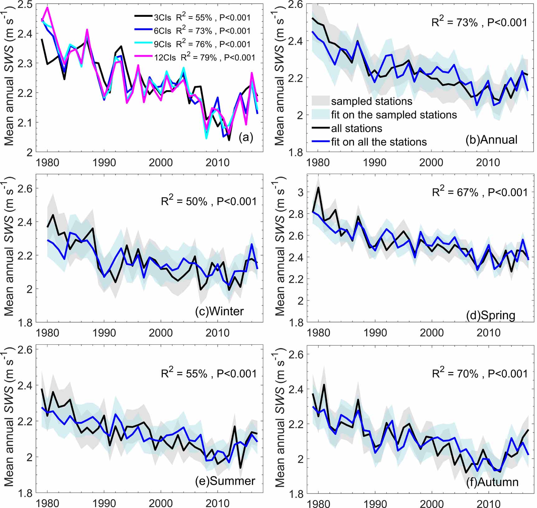 Figure 4. (a) Temporal changes of RWSs with different CIs based on a stepwise forwarding regression algorithm; (b)–(f) temporal changes of observed wind speeds (black lines) and RWSs (blue lines). Uncertainties of results are indicated by the shading based on a randomly selected 30% subset of the stations (repeated 300 times). Inset black numbers are the correlation coefficients between observed wind speeds and RWSs. (a)–(e) denote annual mean, winter, spring, summer, and autumn, respectively.