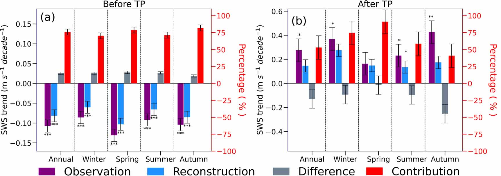 Figure 5. Linear trends of observations and RWSs (unit: m s−1 decade−1), and their differences, as well as the relative contributions of LOACs (unit: %) to the long-term changes in SWSs before and after the TP. (a) and (b) denote the periods before and after the TP, respectively. The significances of the trends are as follows: *, **, and *** denote the trends passing the significance t-test at the 0.10, 0.01, and 0.001 levels, respectively. Blank indicates a trend is not significant. Black bars denote the uncertainty ranges of the estimation results. Difference denotes the trend difference between RWSs and observations (RWSs minus observations).