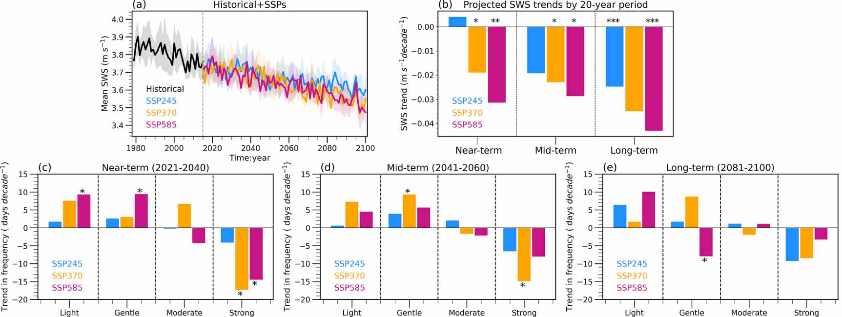 Figure 6. (a) Temporal changes of mean annual SWS over eastern China from 1979 to 2100 (unit: m s−1). Historical (black), SSP245 (light blue), SSP370 (yellow), and SSP585 (red) simulations by the EC-Earth3 model are shown for the 25th and 75th percentiles (shading). (b) Projected trends of SWSs for near-term (2021–2040), mid-term (2041–2060), and long-term (2081–2100) under the SSP245 (light blue), SSP370 (yellow), and SSP585 (red) scenarios (unit: m s−1 decade−1). (c) Projected trends in frequencies of different wind categories for the near-term projection (unit: d decade−1). Light blue, yellow, and red bars denote the SSP245, SSP370, and SSP585 scenarios, respectively. (d) and (e) are the same as (c), but for mid-term and long-term projections, respectively. *, **, and *** denote the trends passing the significance t-test at the 0.10, 0.01, and 0.001 levels, respectively. Blank indicates a trend is not significant.