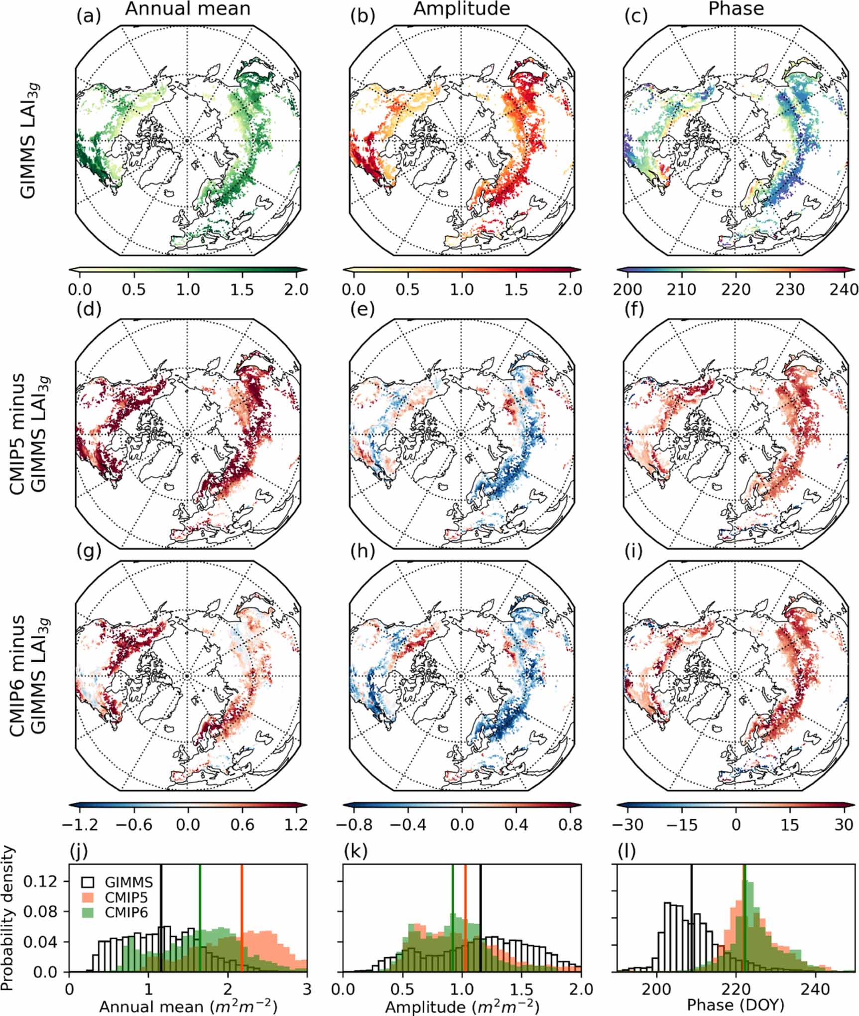 Figure 2. Mean distributions of LAI annual mean, amplitude, and phase from the GIMMS LAI3g (a)–(c), and the arithmetic differences to those simulated by CMIP5 (d)–(f) and CMIP6 (g)–(i) models. Probability density functions of annual mean, amplitude, and phase (j)–(l) of the GIMMS LAI3g and the CMIP5 and CMIP6 simulations, with their means (vertical lines) are denoted in black, orange, and green, respectively.