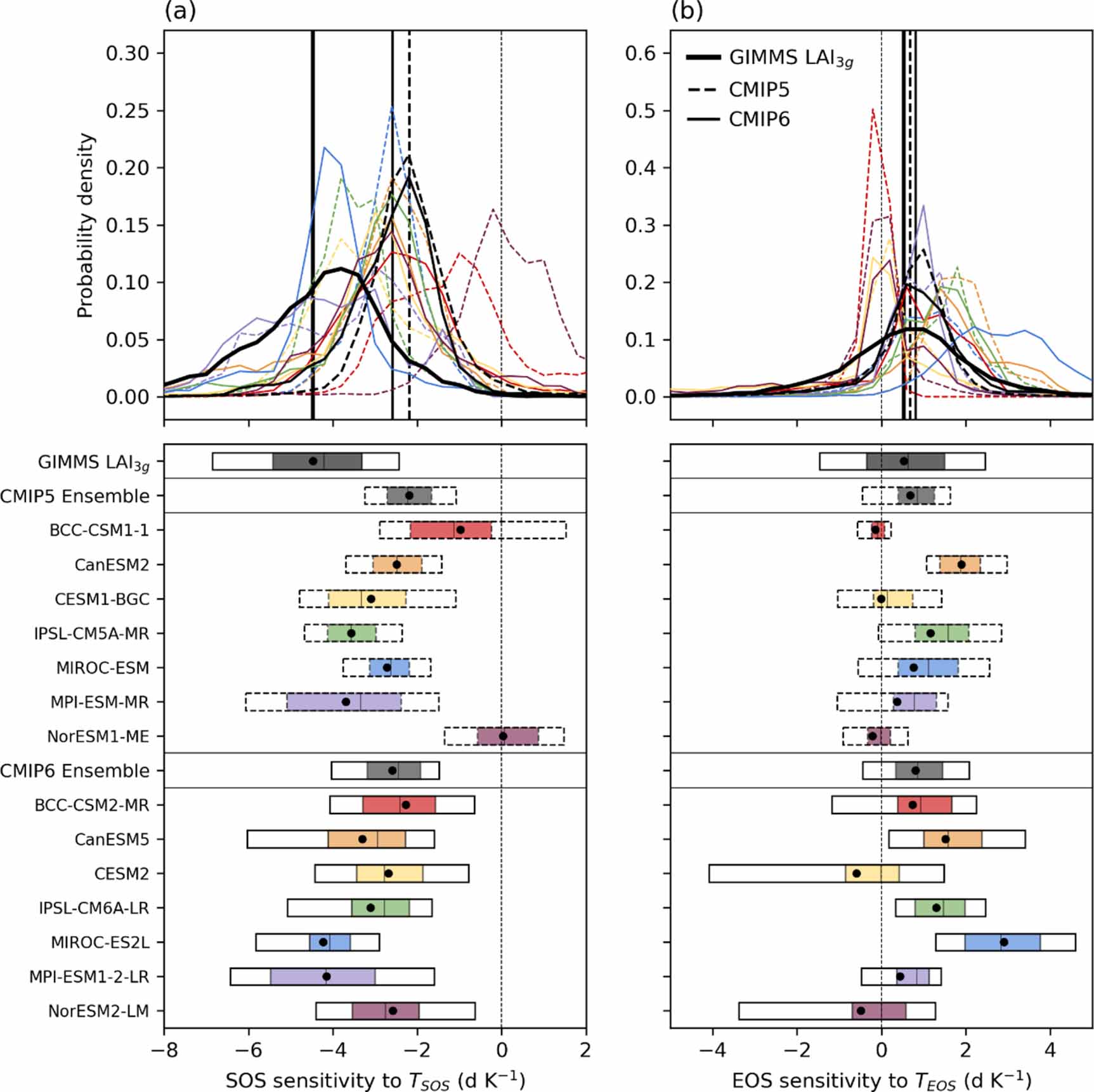 Figure 5. Probability density functions of interannual sensitivities of (a) SOS to TSOS and (b) EOS to TEOS for the observation-based datasets (GIMMS LAI3g with CRU TS; denoted as thick black line), CMIP5 ensemble (dashed black line), CMIP6 ensemble (solid black line), and each CMIP5 (dashed line) and CMIP6 (solid line) model in deciduous forests over the northern extratropics (>30° N) from 1982 to 2014. The means of probability density functions are indicated as vertical lines for observation-based datasets, CMIP5, and CMIP6 ensembles. The ranges of the 10th to 90th percentiles (white box), 25th to 75th percentiles (shaded box), medians (vertical bar), and means (closed circle) are also denoted.