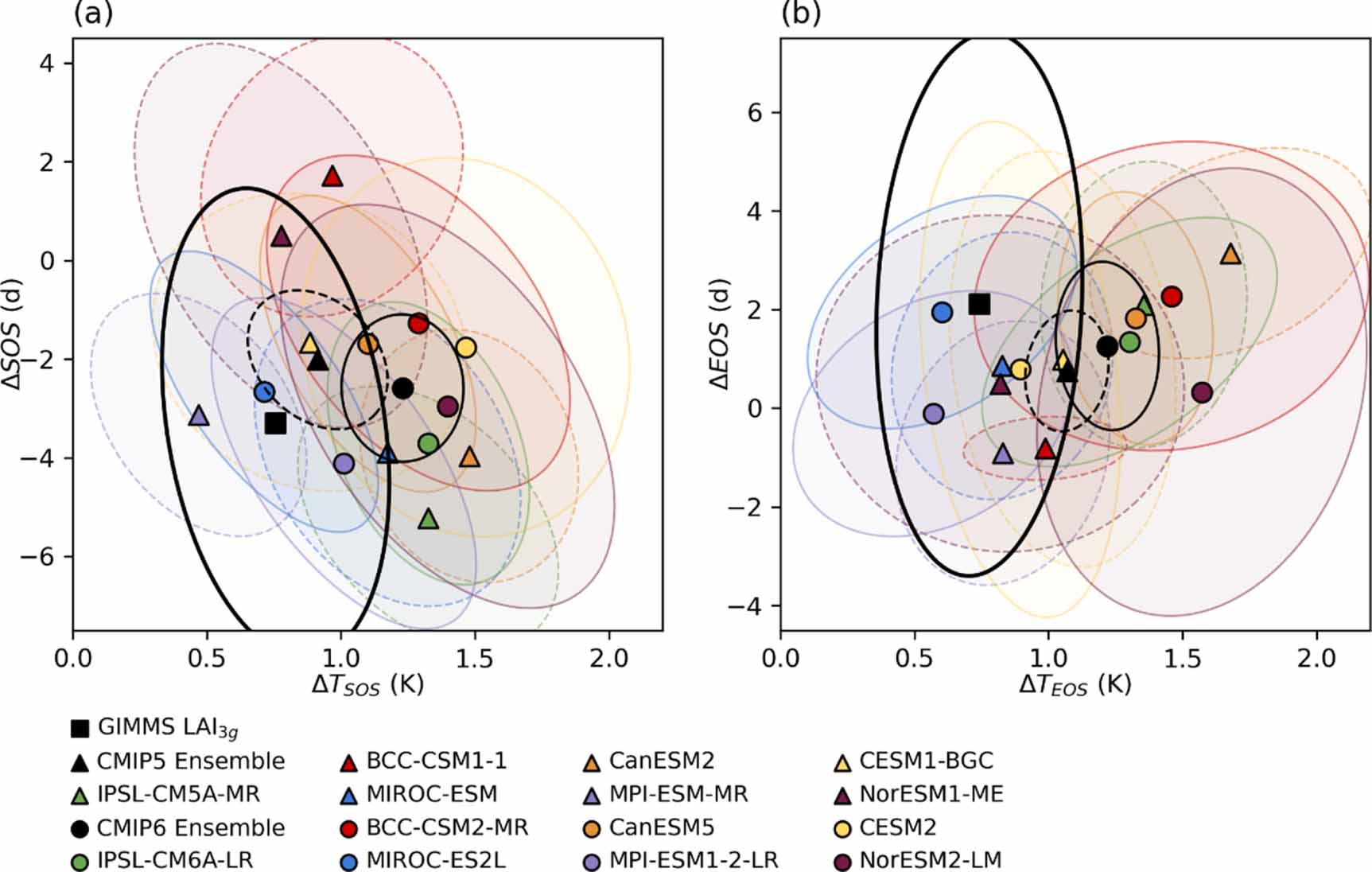Figure 6. Scatter plots of spatially averaged (a) ΔSOS with ΔTSOS (b) ΔEOS with ΔTEOS in the observation-based datasets (GIMMS LAI3g with CRU TS; denoted as black squares), CMIP5 (triangles), and CMIP6 (circles) models in northern temperate and boreal forests. The ellipses represent one-standard-deviation confidence regions of the distributions in the observation-based datasets (thick black line), CMIP5 ensemble (dashed black line), CMIP6 ensembles (solid black line), and each model in CMIP5 (dashed lines) and CMIP6 (solid lines). Outliers exceeding two standard deviations were excluded from the analyses.