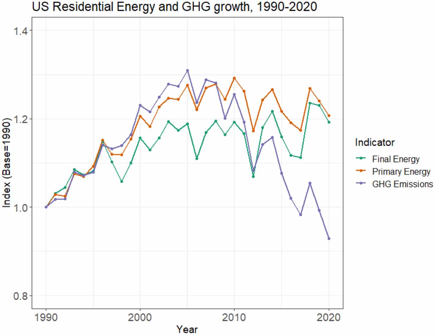 Figure 1. Indexed growth in US residential final energy, primary energy, and GHG emissions, 1990–2020. Data from tables 2.2 and 11.2 of EIA monthly energy review (EIA 2020b). 2020 values based on extrapolation of 9 month totals. The recent spike in indices 2018 is largely weather related (EIA 2019c).