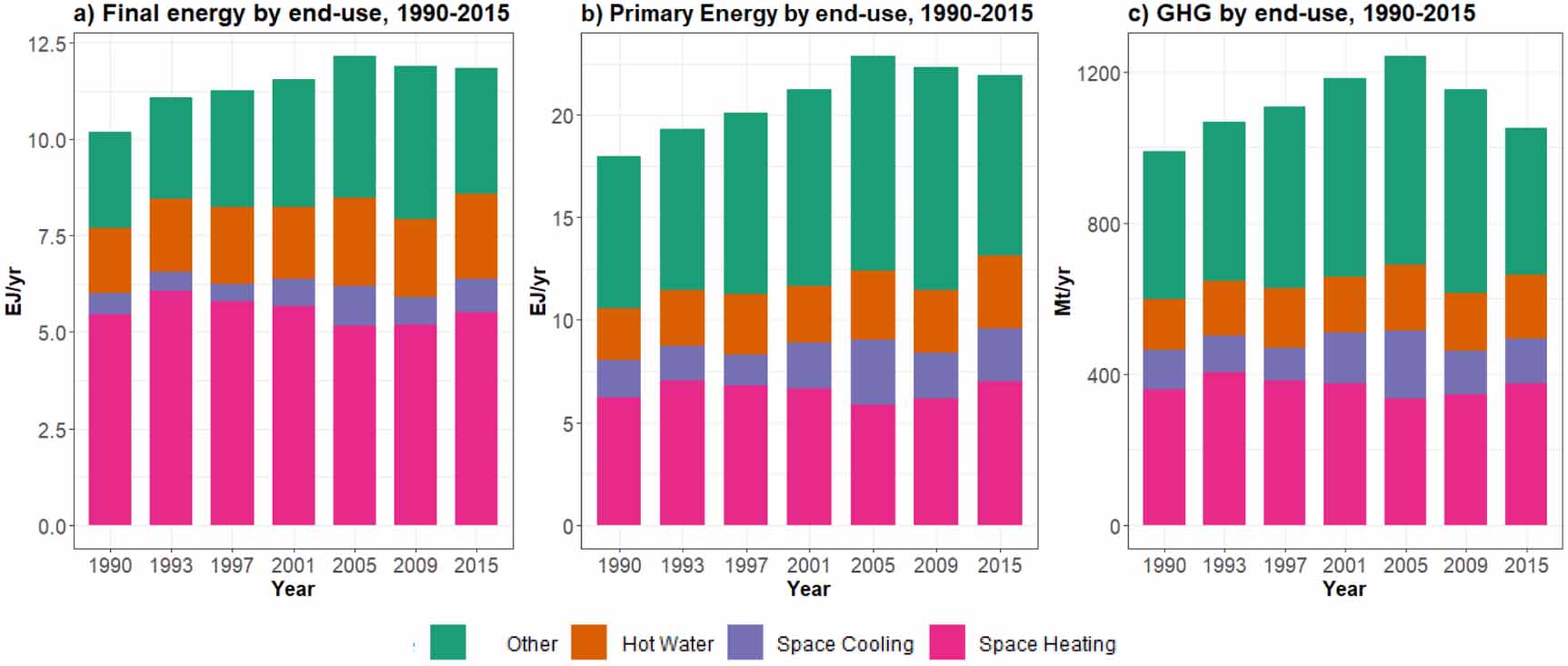 In figure 2, we present final energy demand, primary energy, and GHG emissions by end-use for selected years 1990–2015. Weather adjusted versions of these figures are shown in SI figure S2. Space heating is the largest source of final energy demand, making up about 50% of the total each year. However, space and water heating become less important, and electricity dominated space cooling and other end-uses become more important when looking at primary energy and GHGs, due to the higher primary energy requirements and GHG intensity of electricity. In 2015, other end-uses accounted for around 28% of final energy and 37% of GHG, while space heating contributed 47% to final energy and 36% to GHG.