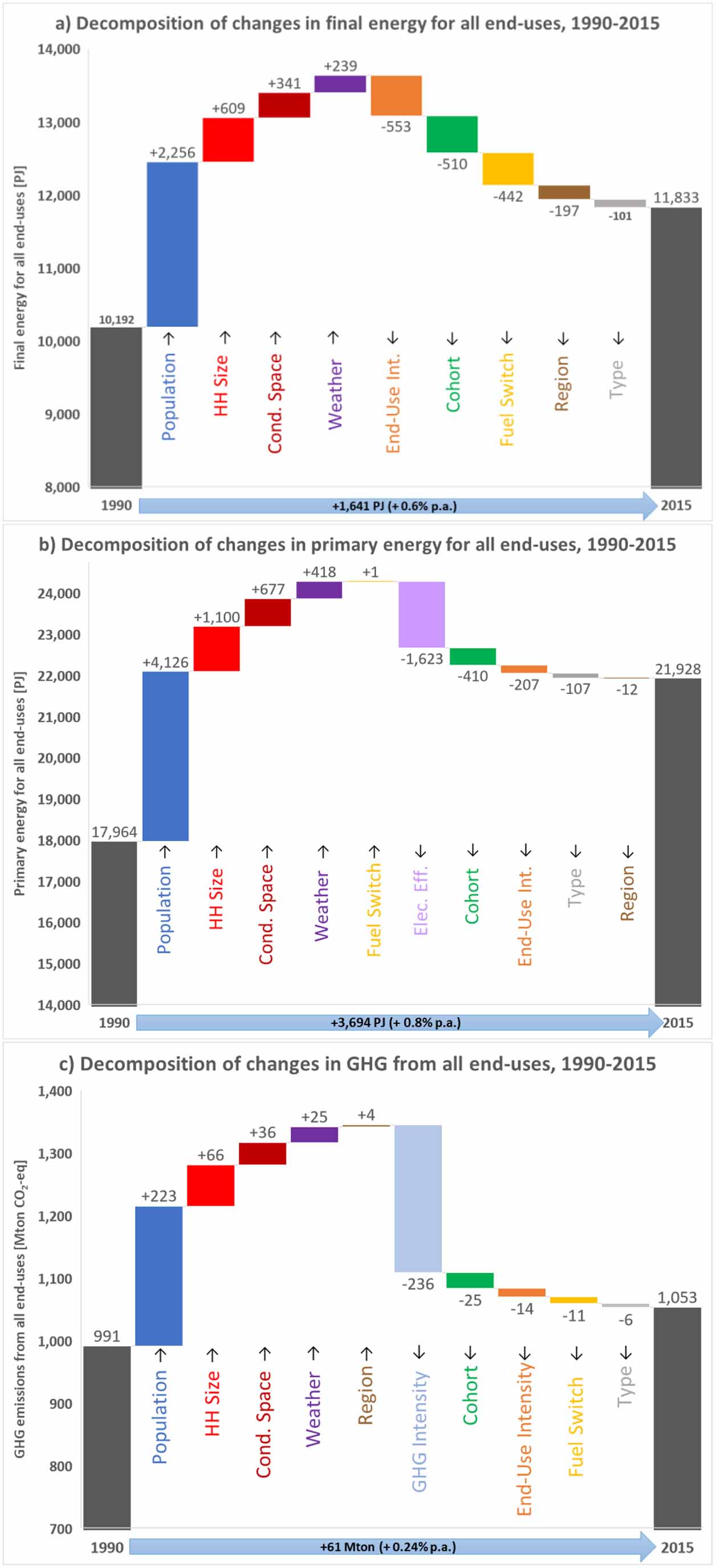 Figure 3. Decomposition of changes in (a) residential final energy, (b) primary energy, and (c) GHG emissions, 1990–2015. 'Elec Eff.' refers to the electricity efficiency effect based on changes in the primary energy index XE.
