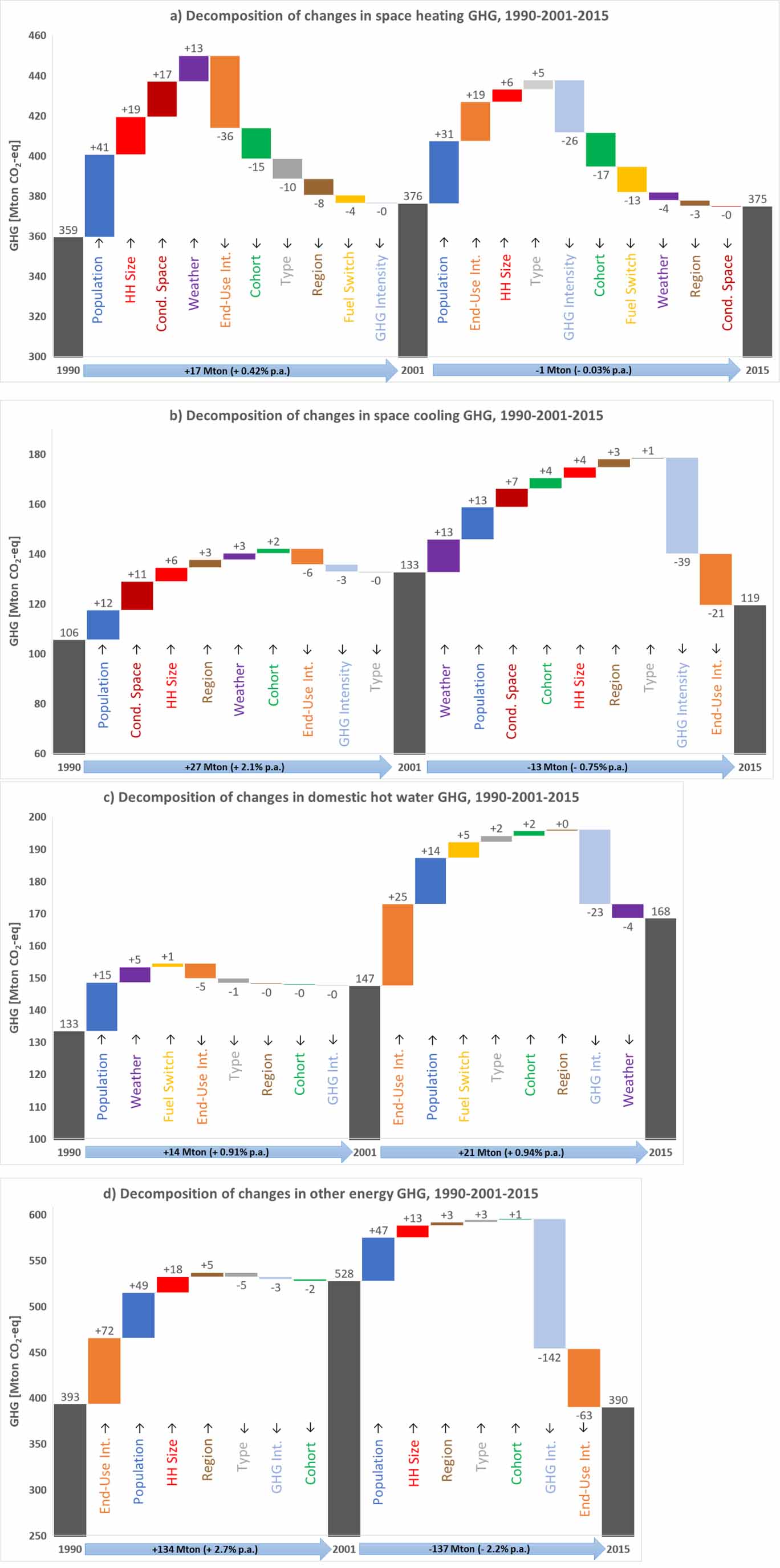 Figure 4. Decomposition of changes in residential GHG emissions 1990–2001–2015 from (a) space heating, (b) space cooling, (c) domestic hot water, and (d) other end uses.