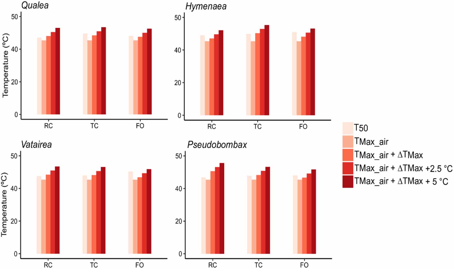 Figure 3. Projection of temperature for future climates of species co-occurrent in savanna RC = rocky cerrado, TC = typical cerrado and FO = forest (cerradão) vegetation of the Amazonia-Cerrado transition. Loss of 50% of photosystem II function (T50), maximum air temperature = 45.4 °C (TMax_air), maximum air temperature + excess leaf temperature (TMax_air + ΔTMax), estimated maximum leaf temperature with an increase of 2.5 °C (TMax_air + ΔTMax + 2.5 °C) and estimated maximum leaf temperature with an increase of 5 °C (TMax_air + ΔTMax + 5 °C).