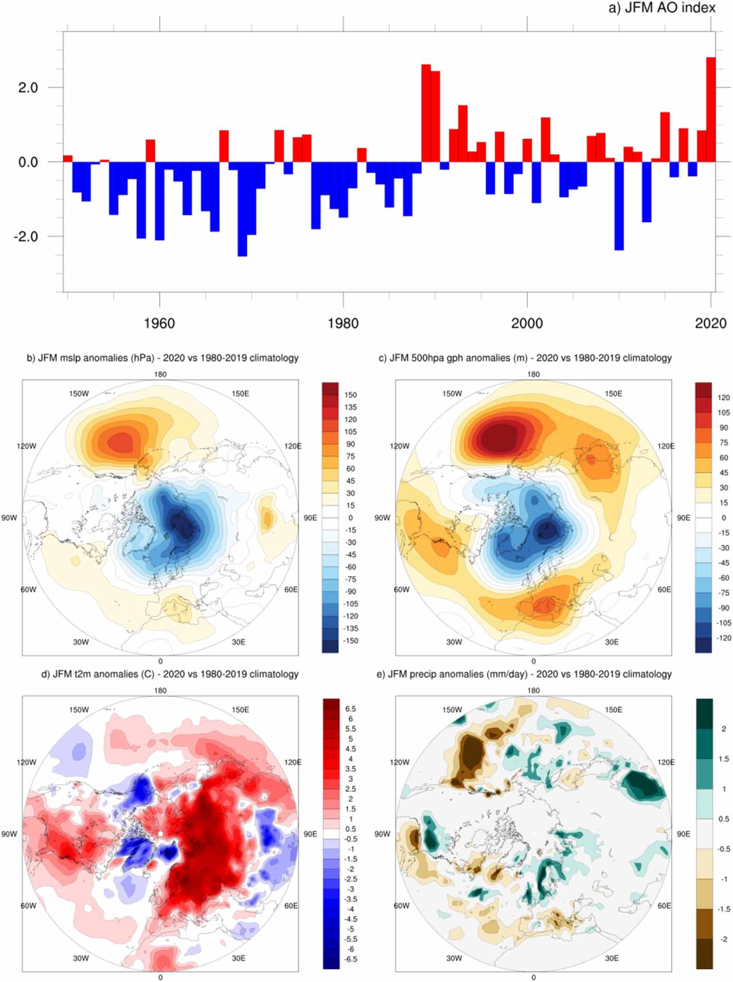 Thus, the JFM 2020 SLP and Z500 anomalies as well as the temperature and precipitation anomalies revealed an extremely strong positive phase of the AO, with the JFM AO index being the highest on the record, at least since the early 20th Century.