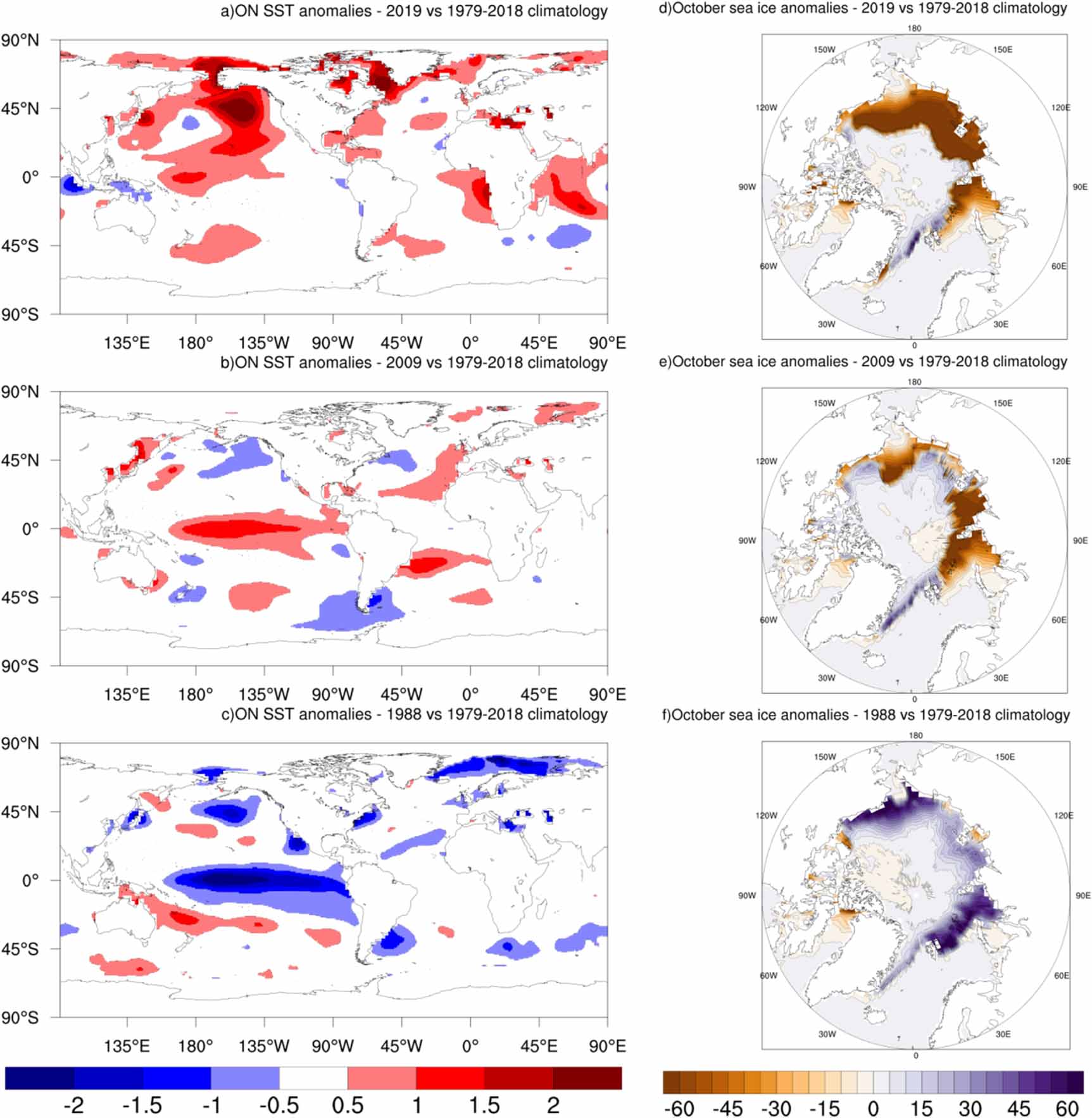 Given October and November precursors, we might have expected the wintertime AO index to be negative in 2020. Figure 2 shows the SST anomalies for October and November (ON, hereafter), and the sea ice anomalies for October preceding three extreme AO winters (2019, 2009 and 1988). In ON 2019, the positive SST anomalies (figure 2(a)) covered the equatorial central Pacific, with the Niño3.4 index being positive (+0.5). Similar positive SST anomalies and the positive Niño3.4 index (+1.3) were observed in ON 2009 (figure 2(b)) preceding the extremely negative AO winter. On the other hand, in 1988, before the extremely positive AO winter, the SST anomalies in the equatorial central Pacific and the Niño3.4 index (−1.8) were negative (figure 2(c)). Thus, the autumn equatorial central Pacific SST anomaly and the ENSO predicted a negative AO phase rather than a positive, in accordance with Bell et al (2009), Hall et al (2014), and Fletcher and Cassou (2015). The relationship between the AO indices and the ENSO is not strong (L'Heureux and Thompson 2005), at least for moderate AO events. However, it is the first occurrence in recorded history where an extreme positive AO event was preceded by a developing El-Niño.