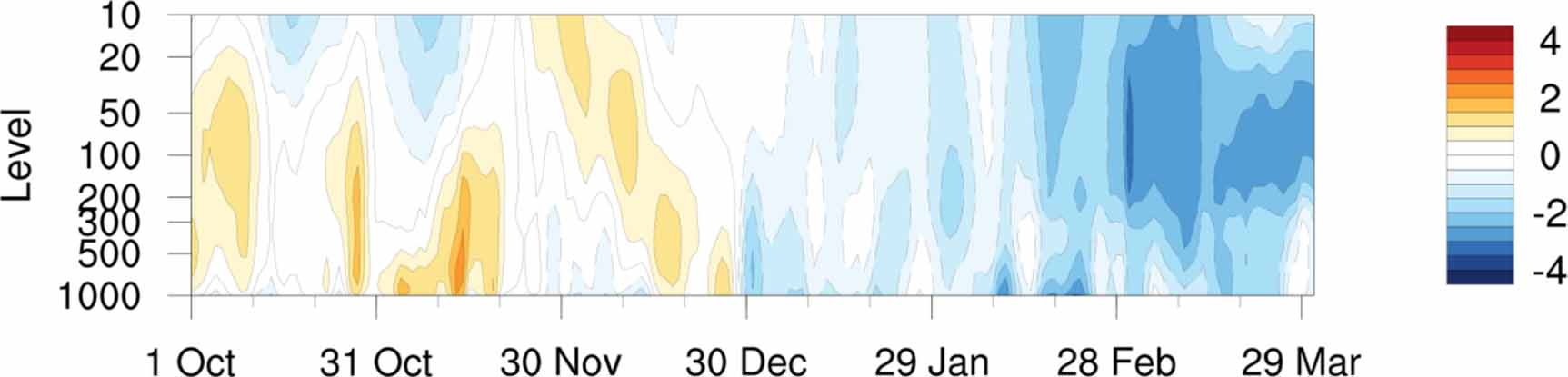 Figure 3 shows the polar cap daily normalized geopotential height anomalies from October 1 to March 31. The positive anomalies spanned the whole troposphere and lower stratosphere in October similarly to 2009 (figure 1(a) of Cohen et al 2010). In November and December, the development of the negative AO event continued, with the positive anomalies becoming stronger and progressing upwards in November and then back downwards during December. This evolution closely matches the general scheme of the development of the negative AO event suggested by Baldwin and Dunkerton (2001) and Cohen et al (2007). Also, this evolution was similar (with some two-three week lag) to that of 2009 (figure 1(a) of Cohen et al 2010). Therefore, establishing of the moderate positive (at least, near zero) polar cap anomalies in the troposphere was expected. Furthermore, the geopotential height anomalies in the stratosphere were near zero and no negative anomalies could descend in late December.