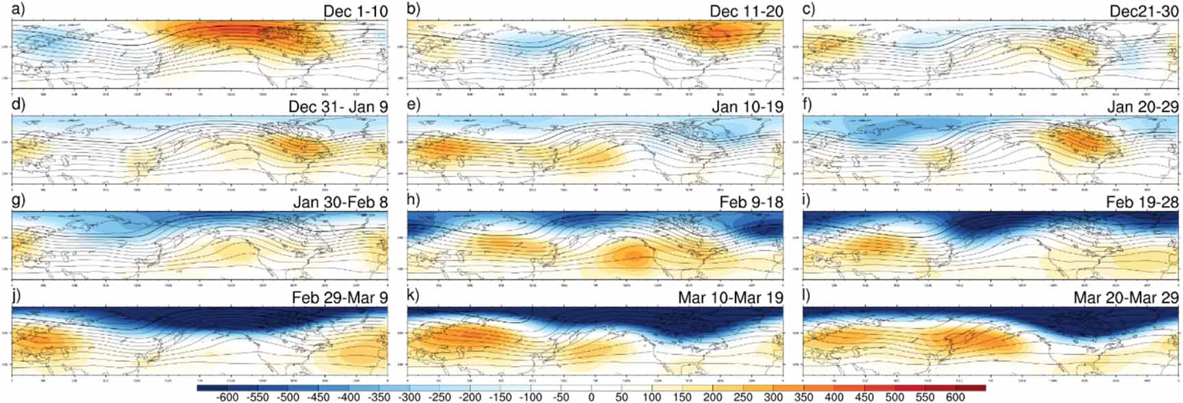 Standard image High-resolution imageFigure 5. Succession of the 10 d averaged geopotential height anomalies (shading, (m)) and climatology (contours) of the 70 hPa surface for 120 d from 1 December until 29 March. Contour interval is 100 m, and the 17 600 m value contour is of double thickness. The 10 d intervals are shown in the top right hand corner of each panel.