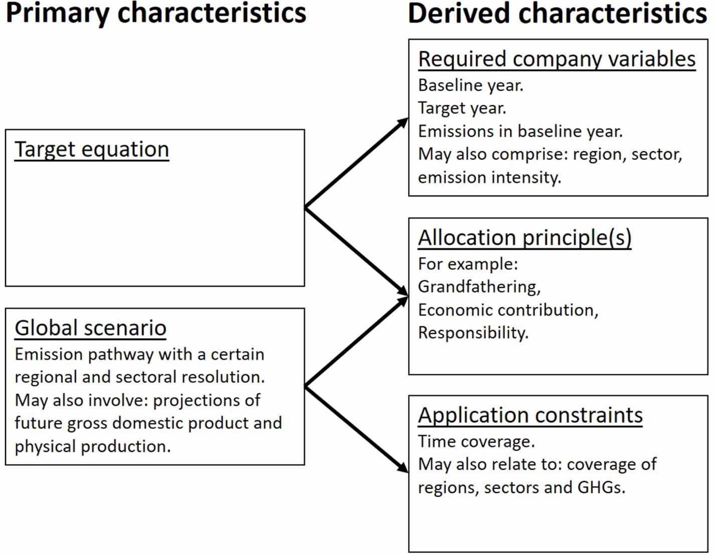 Figure 1 presents our framework for characterizing and comparing SBT methods. Adapted from Faria and Labutong (2019), we distinguish between primary and derived method characteristics and cover application constraints explicitly. The primary characteristics of any SBT method are comprised by a target equation and a global scenario, related to future allowable emissions and, possibly, future economic activity. Derived characteristics, i.e. required company variables, one or more allocation principles and application constraints, are derived from those primary characteristics (black arrows in figure 1).