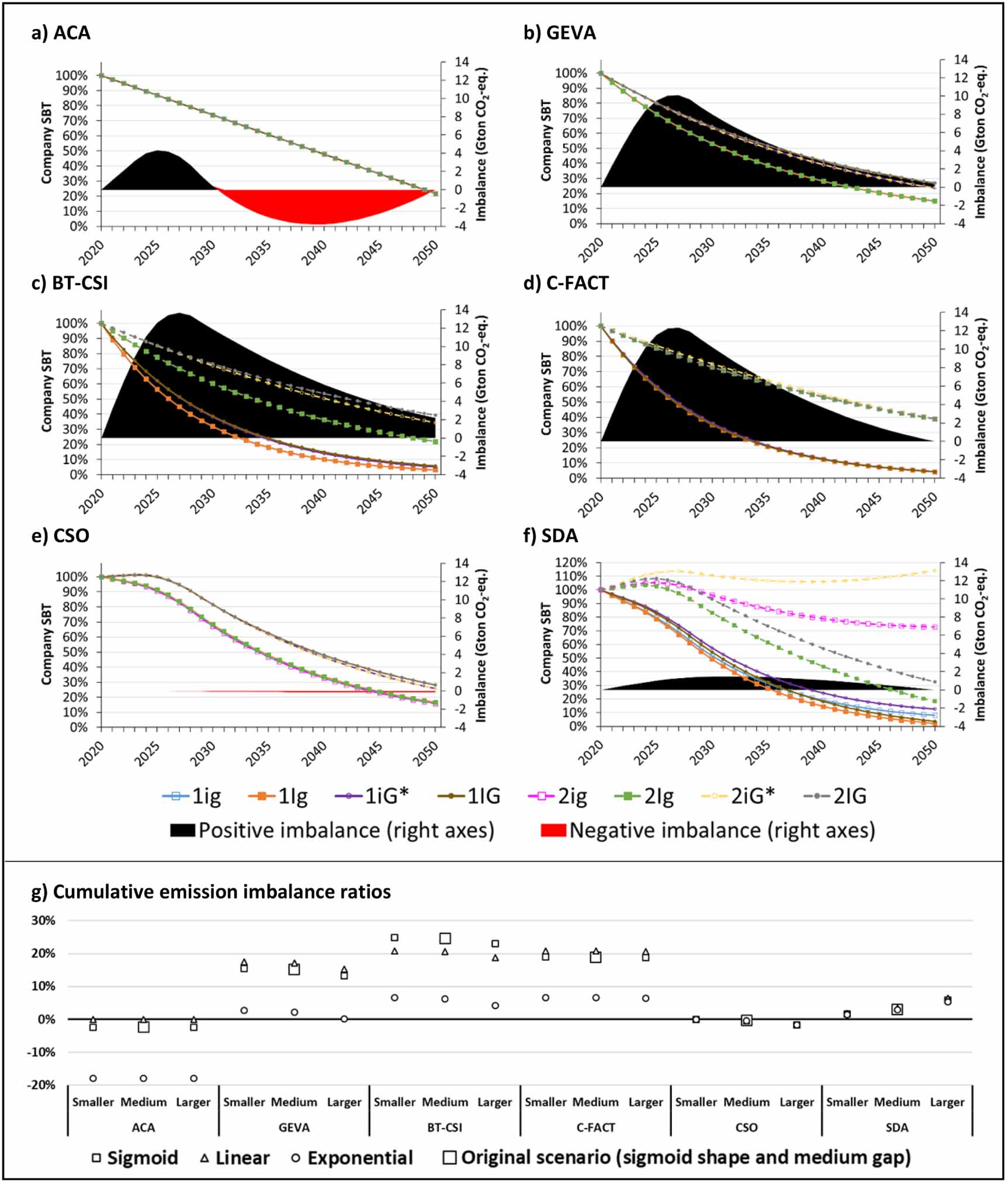 Figure 3. Application of six SBT methods to the eight archetypical companies and corresponding emission imbalance. Figures (a)–(f) show the resulting company emissions pathways and global emission imbalance. The SBTs are presented using the left axes, indexed to 2020, and the emission imbalances using the right axes. Similar charts for the eight sensitivity analysis scenarios are provided in SM 2. Figure (g) presents the cumulative emission imbalance ratios for each method for the original scenario and the eight sensitivity scenarios, according to shape of global emission pathway (sigmoid, linear or exponential) and gap between company variable values (smaller, medium or larger). The methods vary with respect to the shapes of SBT pathways, the extent to which the SBT pathways diverge and the size and sign of emission imbalances. The cumulative emission imbalance ratios vary in sign and are sensitive to distance between company variable values and shape of global emission pathways for most methods (see SM 2 for details).
