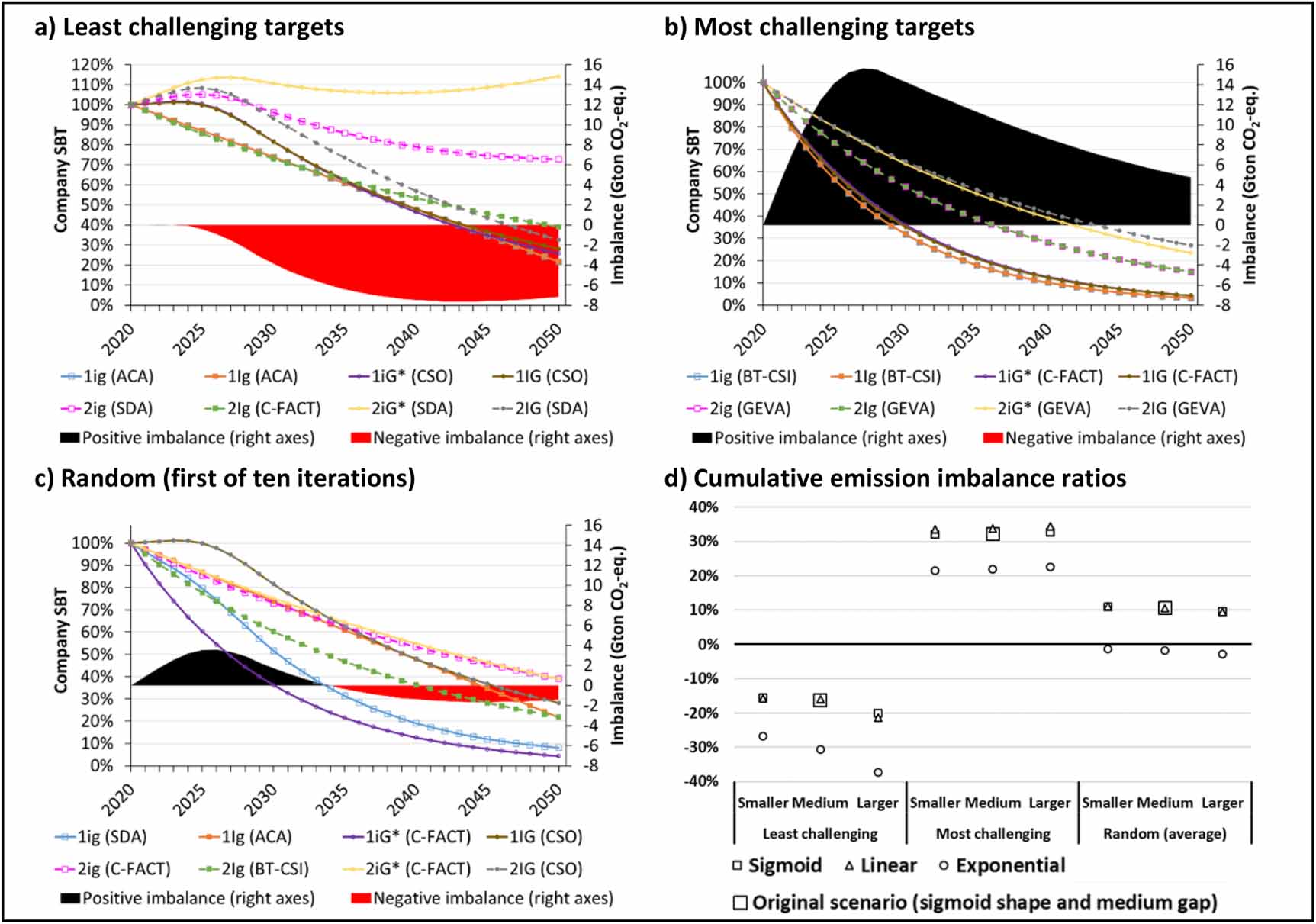 Next, we performed the emission imbalance calculations (equations (1) and (2)) for three hypothetical mixes of methods: (a) selection of the method giving the highest cumulative SBT ('least challenging') for each company; (b) selection of the method giving the lowest cumulative SBT ('most challenging') for each company; and (c) random assignment of methods for each company with ten iterations. All calculations are documented in the supplementary spreadsheet (available online at stacks.iop.org/ERL/16/054019/mmedia).