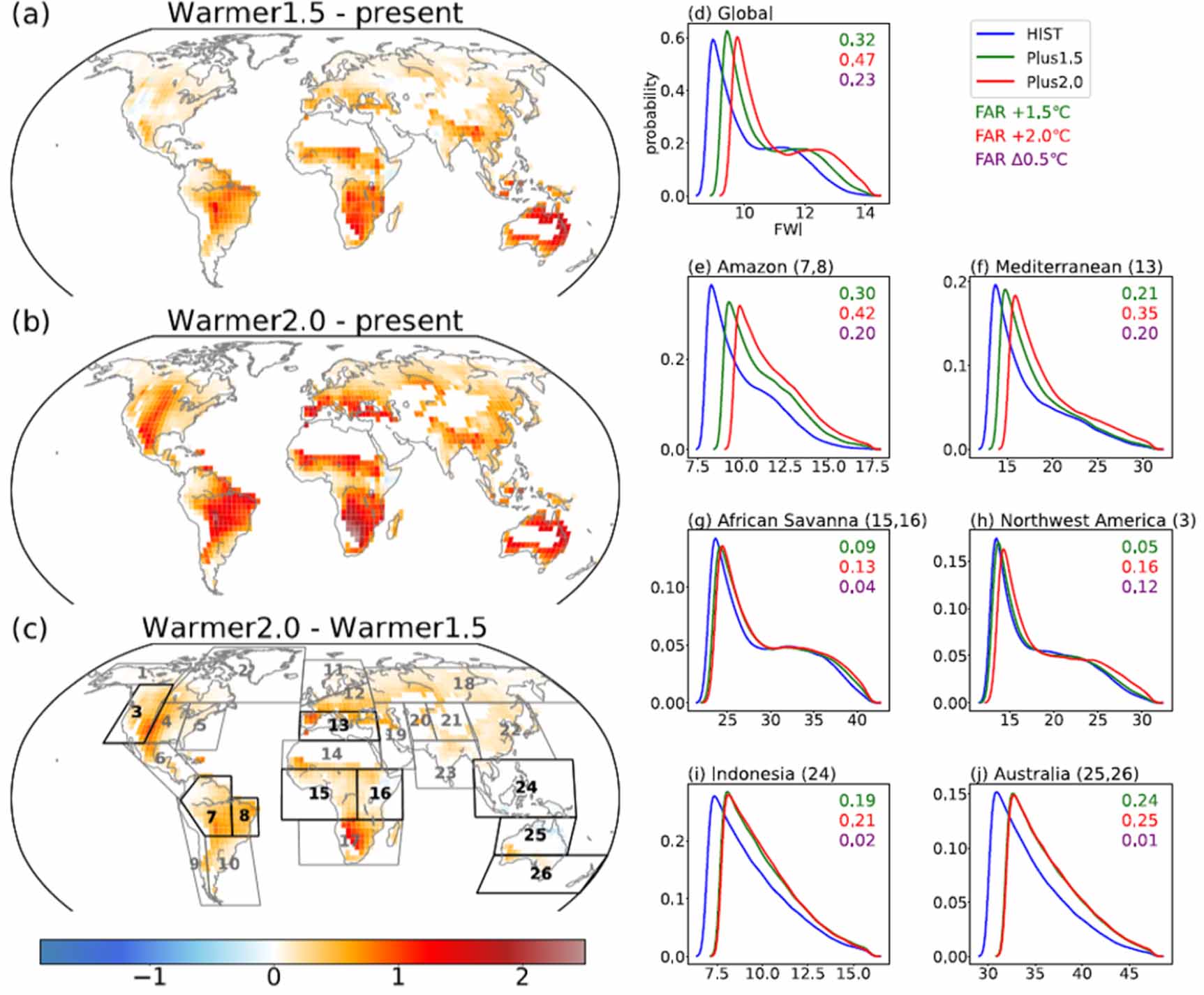 Figure 1. (a)–(c) Annual mean difference of FWI: (a) from 1.5 °C warmer scenario to present (2006–2015), (b) from the 2.0 °C to the present and (c) from the 2.0 °C to the 1.5 °C. Arid areas (shown in the figure S1(c)) and insignificant results (p > 0.01) are masked. (d)–(j) Kernel density estimations of annual mean FWI, spatially averaged based on the IPCC AR5 reference regions (shown in (c), www.ipcc-data.org/guidelines/pages/ar5_regions.html). (d) Global, (e) Amazon, (f) Mediterranean, (g) African savanna, (h) Northwest America, (i) Indonesia and (j) Australia. FAR indicates the fraction of attributable risk for each 1.5 °C (green) and 2.0 °C (red) to P90 (0.9 quantile) in the present and between 1.5 °C and 2.0 °C (purple), respectively. The y-axis explains the probability of FWI (x-axis).
