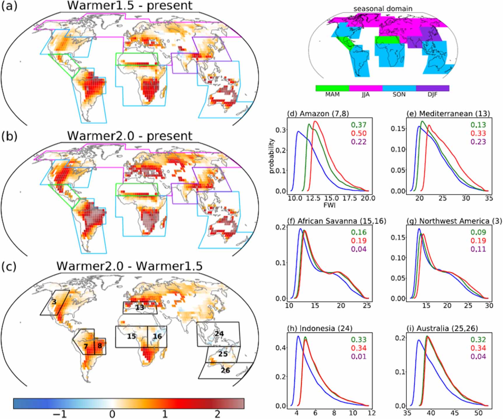 Figure 2. (a)–(c) Seasonal mean difference of FWI during the largest change (separated by four seasons: spring (March - April - May (MAM), green), summer (June - July - August (JJA), pink), autumn (September - October - November (SON), blue), winter (December - January - February (DJF), purple)): (a) 1.5 °C to present (2006–2015), (b) 2.0 °C to present and (c) 2.0 °C to 1.5 °C. Arid areas (shown in the figure S1(c)) and insignificant results (p > 0.01) are masked. (d)–(j) Kernel density estimations of seasonal mean FWI, spatially averaged based on the IPCC AR5 reference regions (shown in (c)). (d) Amazon, (e) Mediterranean, (f) African savanna, (g) Northwest America, (h) Indonesia, and (i) Australia. FAR indicates the fraction of attributable risk for each 1.5 °C (green) and 2.0 °C (red) to P90 (0.9 quantile) in the present, and between 1.5 °C and 2.0 °C (purple), respectively. The y-axis explains the probability of FWI (x-axis).