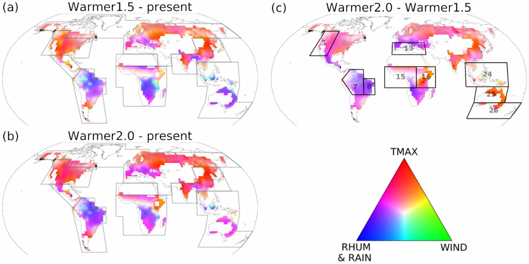 Figure 3. Sensitivity comparison between climate components (maximum temperature (red), relative humidity and precipitation combined (blue) and wind speed (green)) during regionally separated season (same with figure 2, gray boxes): (a) 1.5 °C to present (2006–2015), (b) 2.0 °C to present and (c) 2.0 °C to 1.5 °C. Each component is scaled in range (−0.2 to 1.0). Arid areas (shown in the figure S1(c)) and insignificant results (p > 0.01) are masked. FAR of the major AR5 reference regions (shown in (c)) are summarized in table 1.