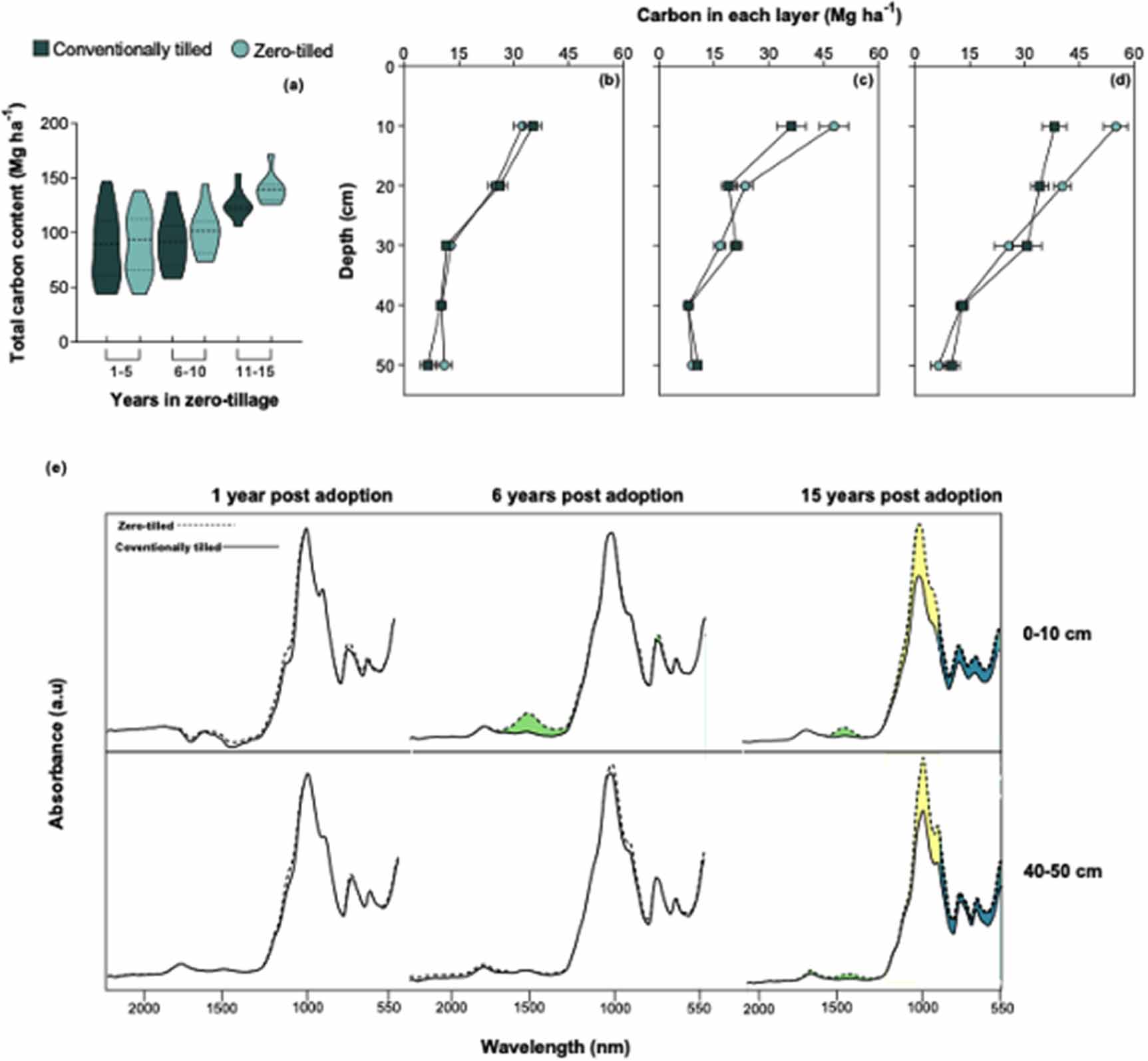 Figure 2. (a) Total carbon content under different managements, with first, median and third quartiles, and the shape showing distribution of individual data points. (b)–(d) Carbon in each soil layer from paired zero and conventionally tilled soils, shown on an equivalent soil mass basis. Soil depths, 0–10, 10–20, 20–30, 30–40 and 40–50 cm correspond to soil mass layers 0–1000, 1000–2000, 2000–3200, 3200–4500, 4500–6200 Mg ha−1, respectively. Mean ± one standard error are shown and n = 51, 21 and 8 for soils under zero-till management for (b) 1–5, (c) 6–10 and (d) 11–15 years, respectively. (e) FTIR spectra to identify organic carbon composition at 0–10 and 40–50 cm for paired observations where soils had been under zero-till management for 1–5, 6–10 and 11–15 years. Green highlights differences in aliphatics, yellow in ethers and blue for aromatics. For the full FTIR spectra at the different depths, see supplementary figure 1.