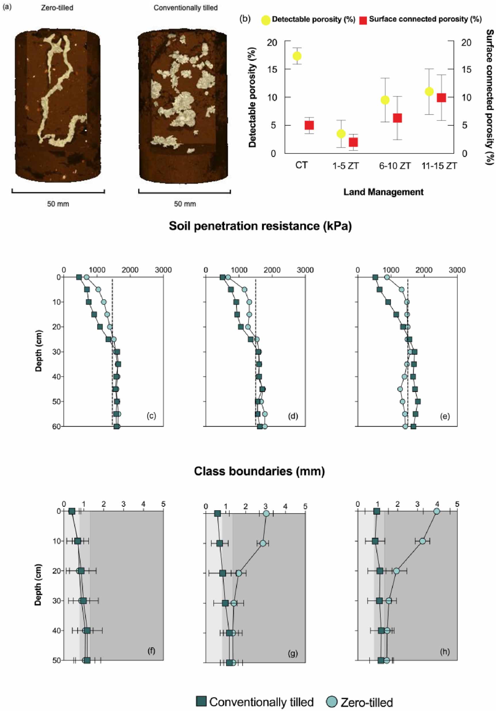 Figure 3. (a) Representative samples from zero and conventionally tilled intact soil cores using x-ray computed tomography. 3D images highlighting the surface connected porosity between the two treatments. (b) The detectable porosity (left y-axis) and surface connected porosity (right y-axis), as analysed using x-ray computed tomography at 50 µm. Soil cores had been in conventional tillage (CT), and between 1 and 5 (1–5 ZT), 6 and 10 (6–10 ZT) and 11–15 (11–15 ZT) years in zero-tillage (ZT). The soil penetration resistance (kPa) (c)–(e) and aggregate stability (f–h) in zero and conventionally tilled soils. The soils had been in zero-tillage for (c), (f) 1–5 years, (d), (g) 6–10 years, and (e), (h) 10–15 years. The dotted line (c)–(e) indicates 1500 kPa. Error bars are not shown as they are smaller than the symbols, see supplementary table 4 for means and standard errors of the means. The different shades of grey (f)–(h) indicate the degree of aggregate stability, with lighter shades showing unstable (<0.8 mm) aggregates, increasing to aggregates with medium stability (0.8–1.3 mm) and stable aggregates shaded in darker grey (>1.3 mm).