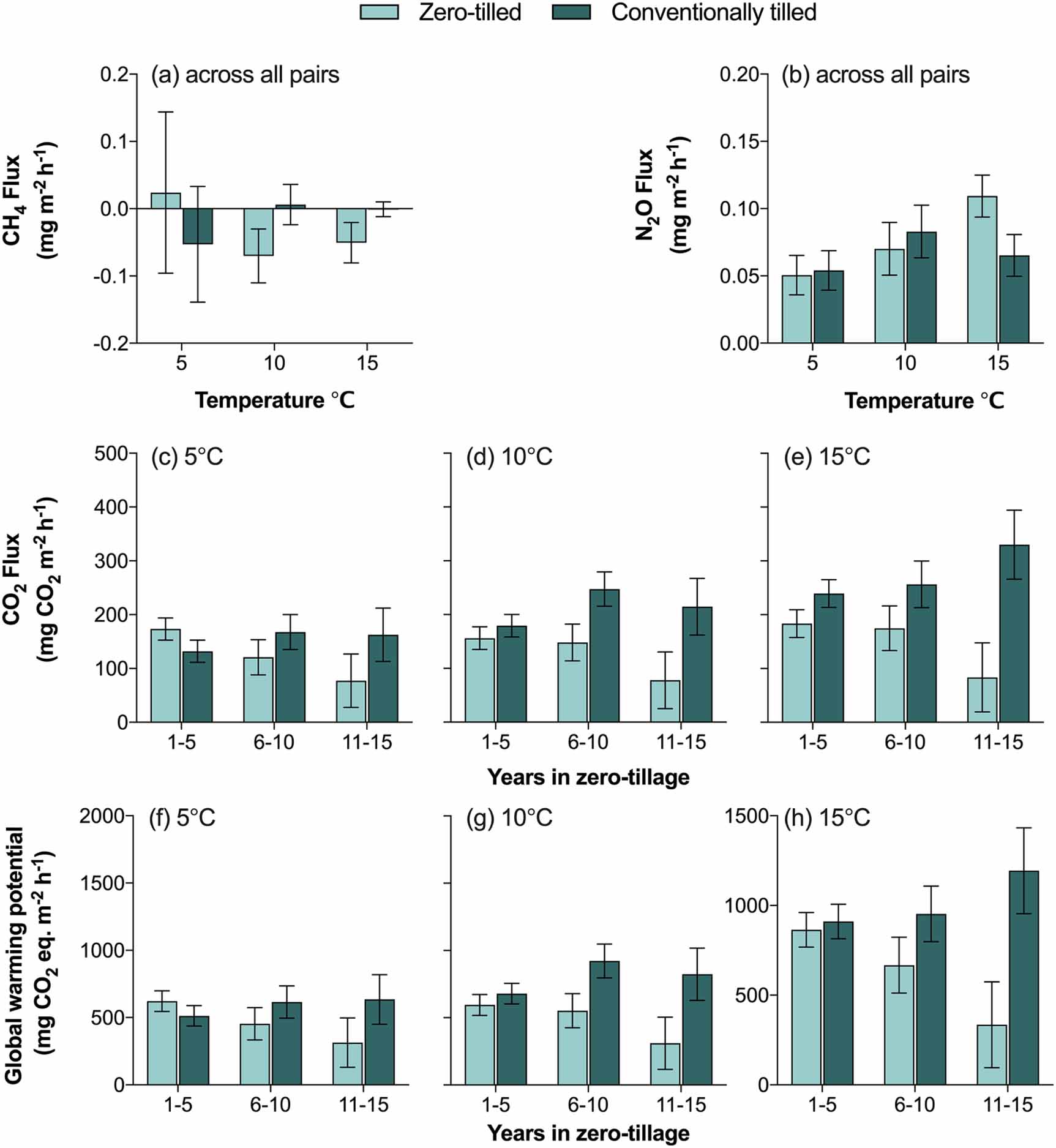 Figure 4. (a) Methane (CH4) and (b) nitrous oxide (N2O) fluxes from zero and conventionally tilled soils incubated at 5 °C, 10 °C and 15 °C. (c)–(e) Carbon dioxide (CO2) fluxes grouped by length under zero-tillage with adjacent conventionally tilled pairs incubated at (c) 5 °C, (d) 10 °C and (e) 15 °C. (f)–(h) Global warming potential (GWP) grouped by length under zero-tillage with adjacent conventionally tilled pairs incubated at (f) 5 °C, (g) 10 °C and (h) 15 °C.