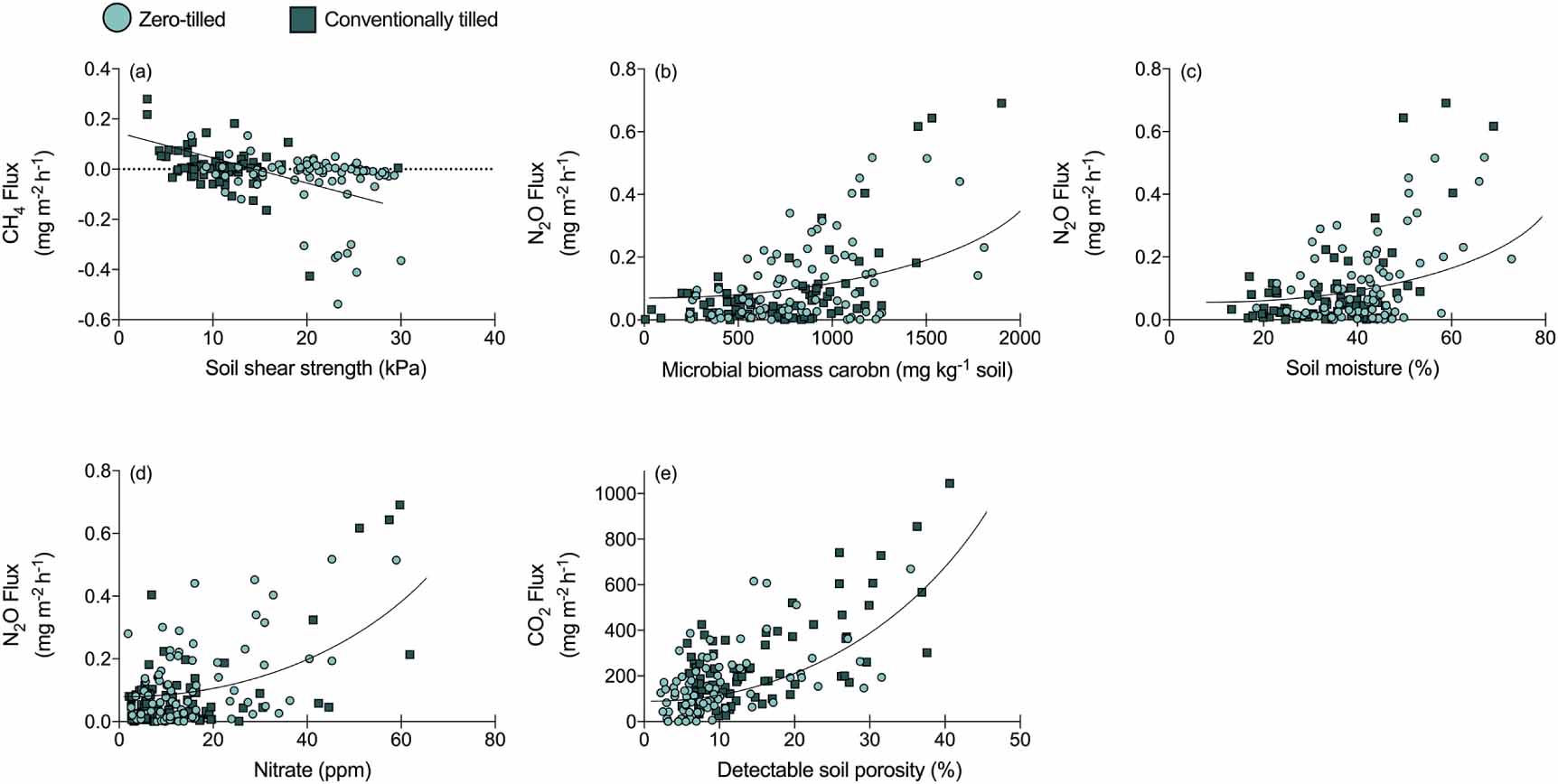 In contrast, N2O fluxes were governed more by substrate (nitrate and carbon) availability and soil moisture content rather than soil physical characteristics. This highlights the importance of regulating fertiliser input (e.g. using fertiliser at the correct time of year, using split applications and nitrification inhibitors) for controlling N2O fluxes, and that changes in physical structure will have only indirect effects through changing soil moisture. We show zero-tillage can significantly reduce CO2 fluxes, and increase CH4 oxidation. Potentially through better management of residue inputs, N2O fluxes could also be decreased, resulting in an even larger climate change mitigation potential of zero-tillage.