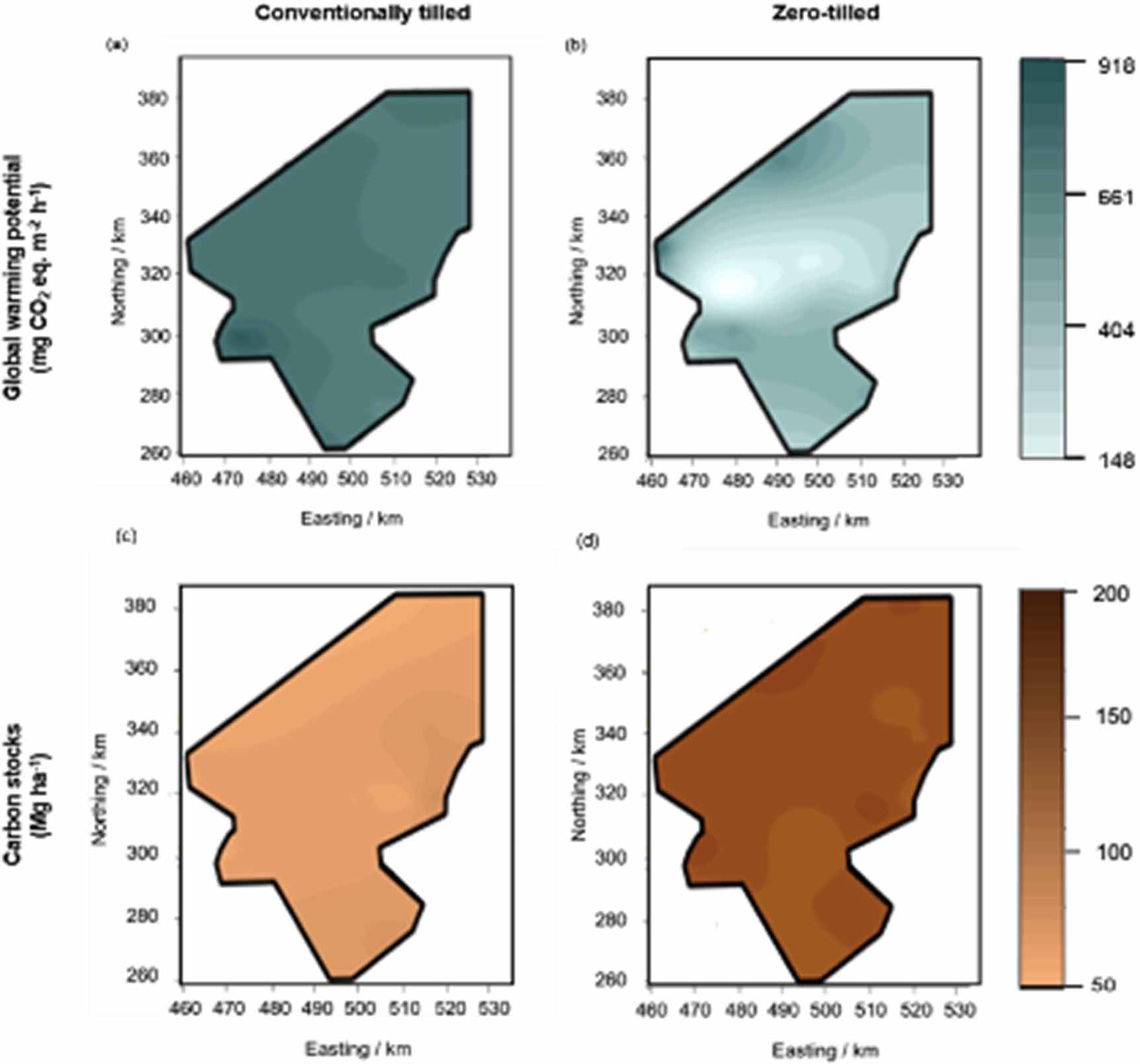 Figure 7. Predicted spatial co-variation of (a), (b) global warming potential in mg CO2 eq. m−2 h−1 and (c), (d) total carbon stocks in Mg ha−1 in (a), (c) conventional and (b), (d) zero-tilled soils. See figure 1(a) in methods for geographical location. Note the scale bars are different within and between managements to illustrate the amplitude of differences. Co-ordinates are relative to the British National Grid-Ordnance Survey.