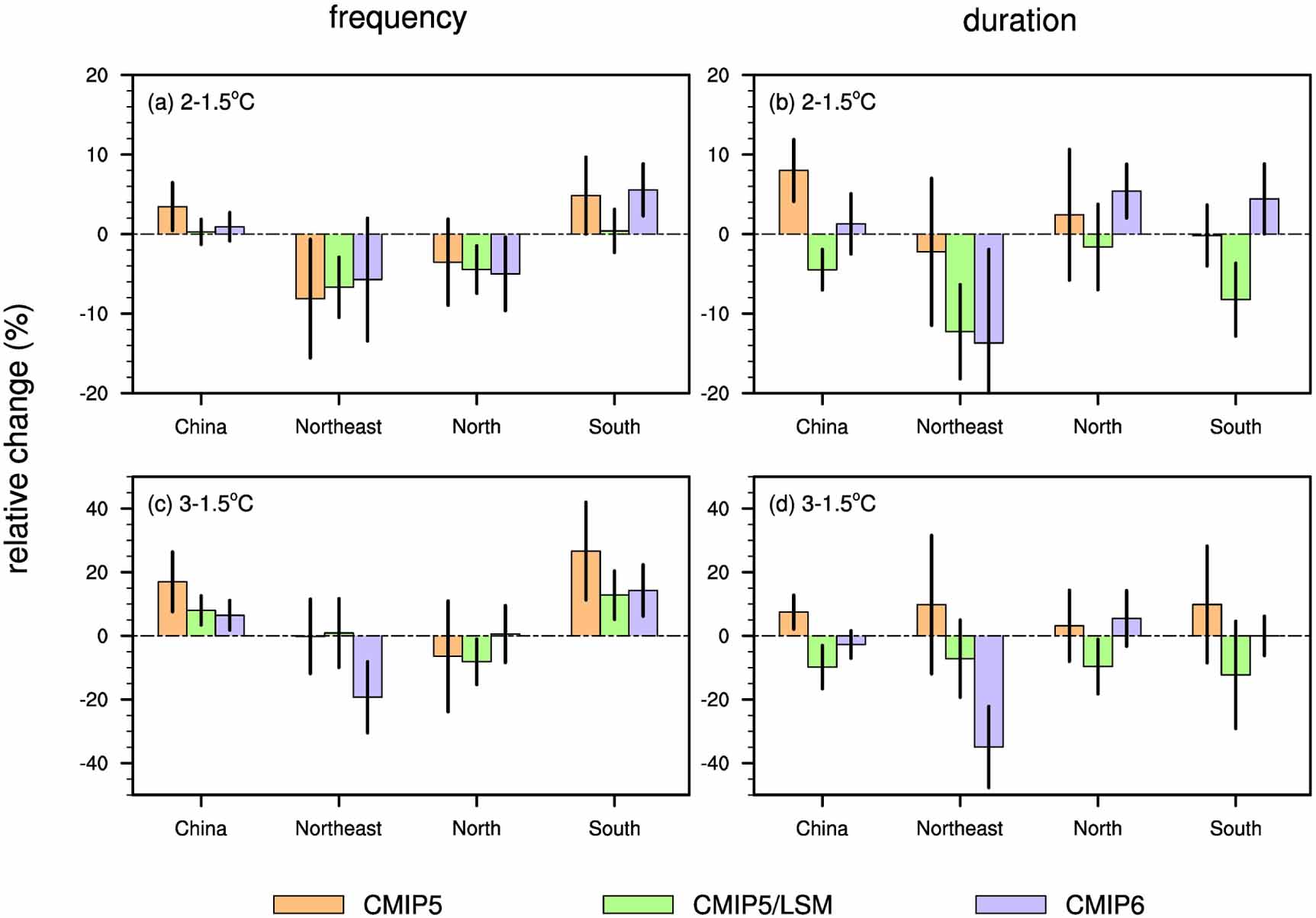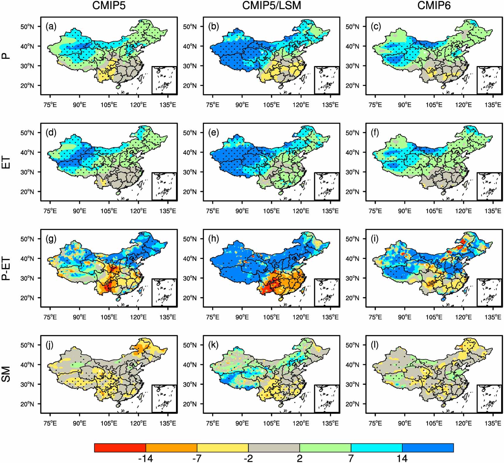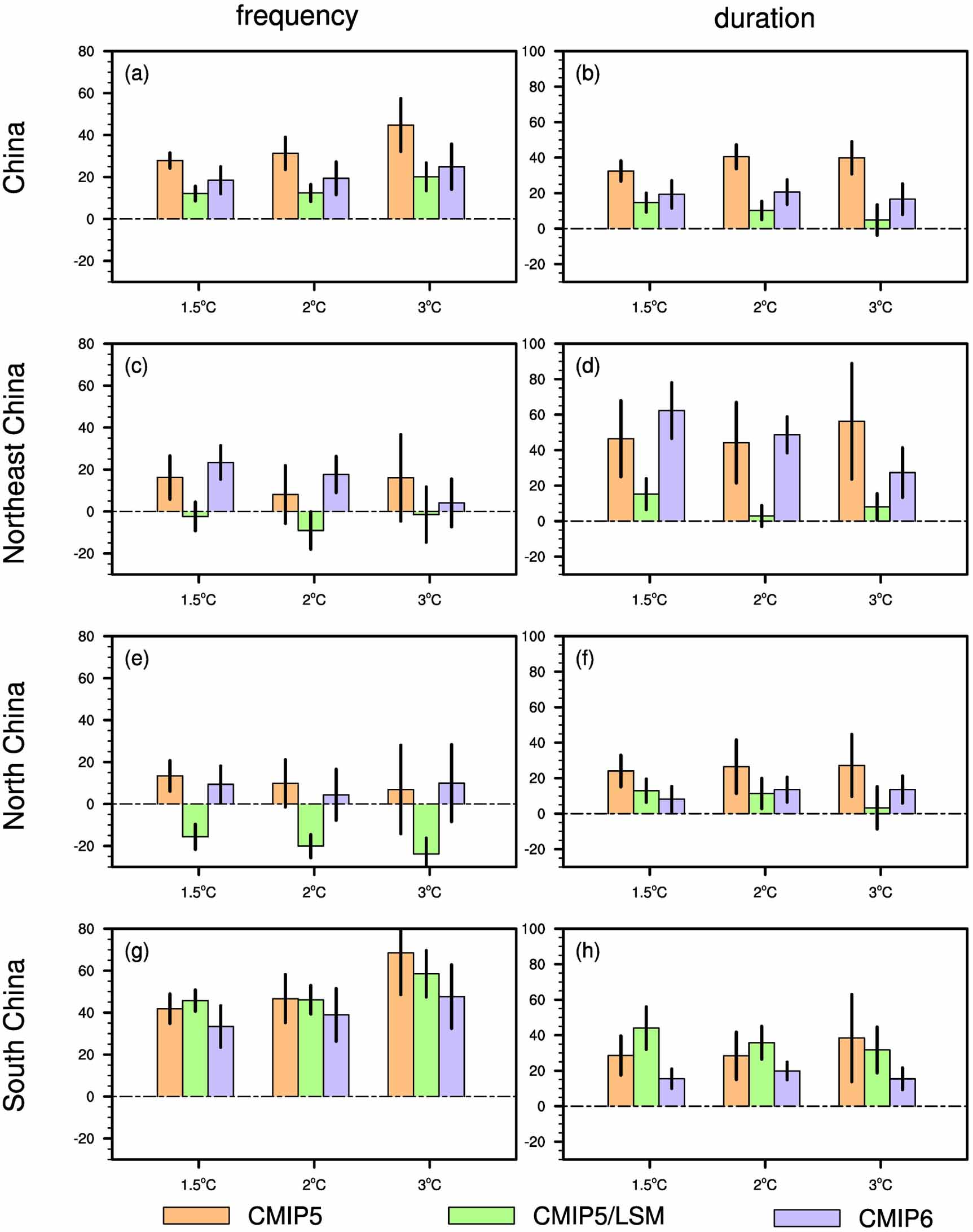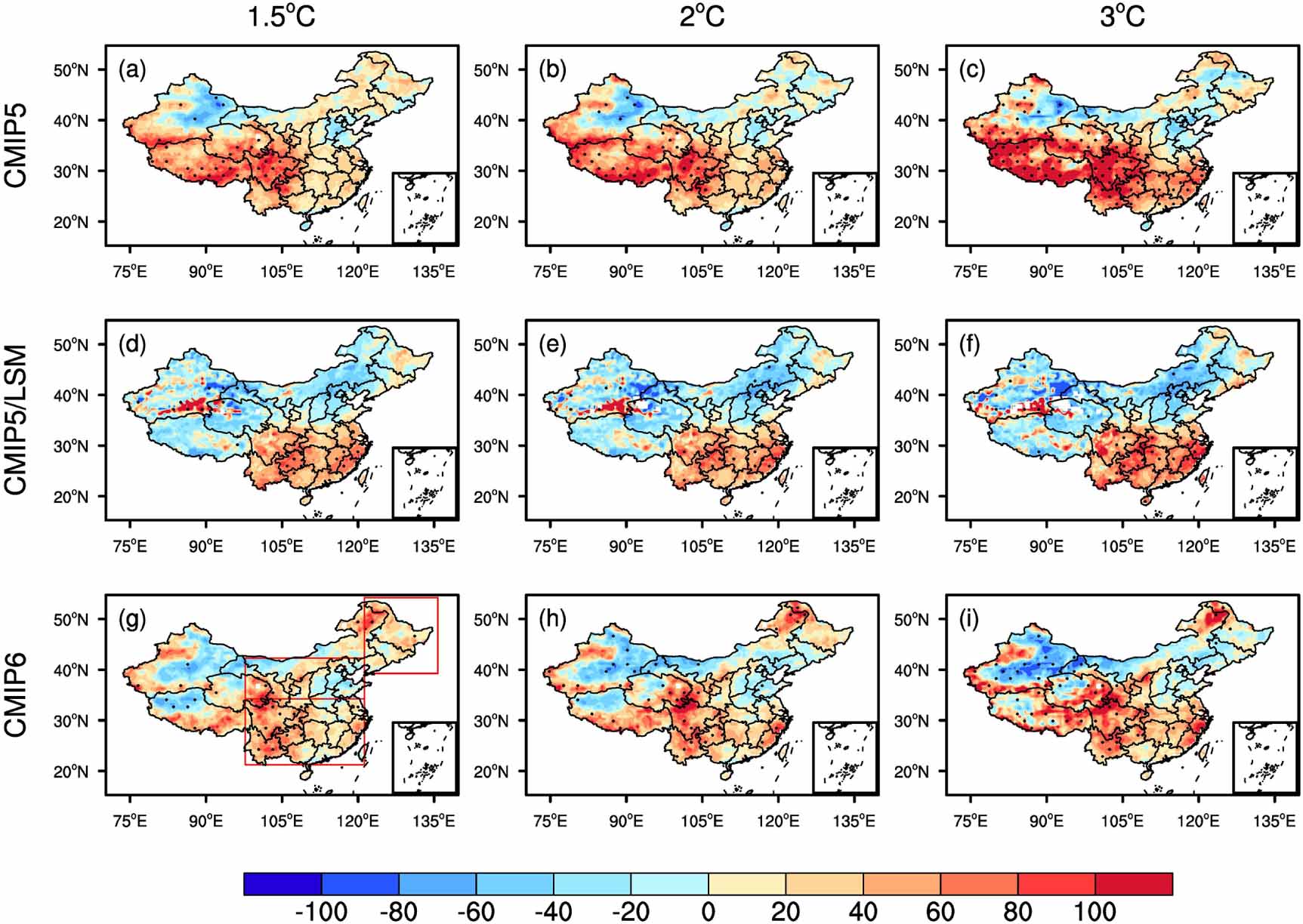 Compared with CMIP5/LSM and CMIP6, CMIP5 shows 34%–56%, 38%–60% and 44%–55% larger increases in drought frequency over China at 1.5 °C, 2 °C and 3 °C warming levels, which may be induced by larger increase in ET projected by CMIP5. The most significant increases in drought frequency and duration occur over South China, where the decrease in P-ET and the consequently decreased SM are responsible for the drought increases for CMIP5 and CMIP5/LSM, but SM dynamics might be related to the drought increase for CMIP6 because there is no significant changes in mean SM.