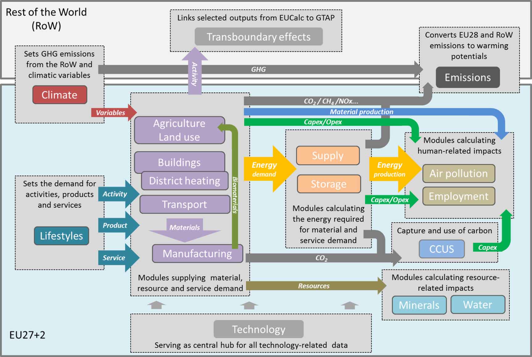 As shown in figure 1, the EUCalc consists of 15 inter-dependent modules representing the supply and demand sides of activities, materials, energy and emissions; as well as different interfaces of the energy system with society and the environment. The lifestyle module calls upon the other modules for the supply of activities, goods and services (Costa et al 2020). Emissions from the energy system are converted in global warming potential via the emissions module to derive a consistent climate impact and account for the effects of mitigation actions within the EU27 + 2 (Price et al 2019). The impacts of trade between the EU27 + 2 and the rest of the world (RoW) as well as embodied emissions are modelled with a modified version of GTAP (Global Trade Analysis Project) in the transboundary effects module (Clora and Yu 2020). Intra and extra EU27 + 2 trade dynamics was shown to have a significant impact on emissions, comparable with the territorial emissions of EU Member States (Costa and Moreau 2019). A description of each module, their main outputs and interlinkages is provided in section1.5 of the SI.