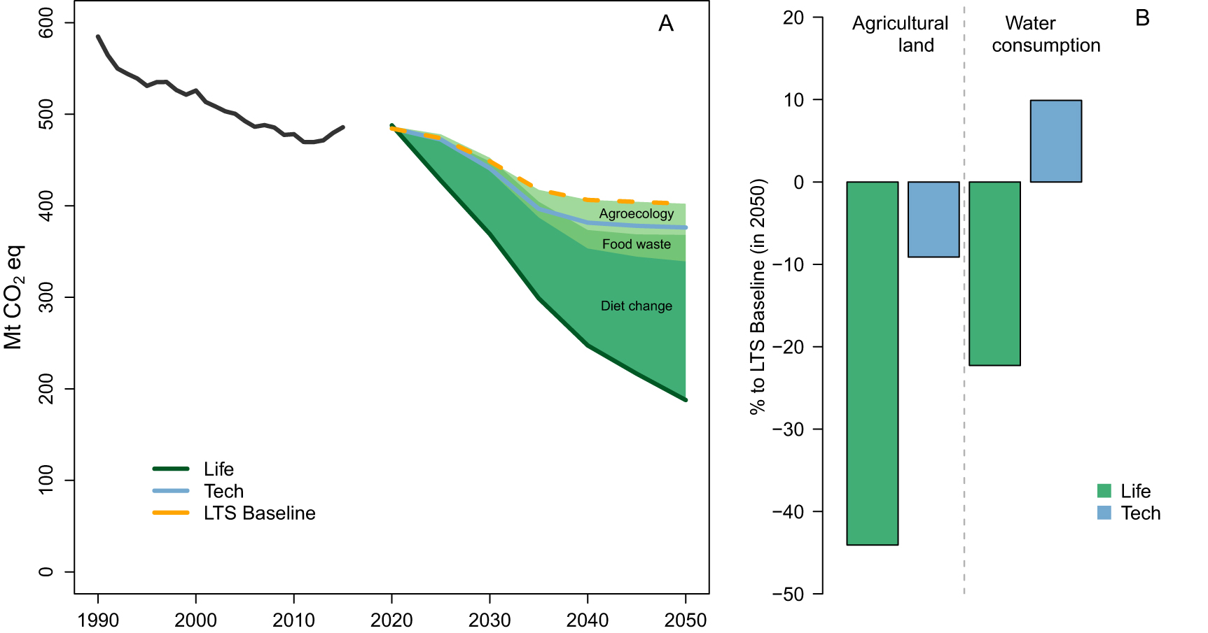 Results from the Life and Tech scenarios show that changes in individual behaviour alone can bring substantial reductions in GHG emissions by 2050 in addition to those of the LTS Baseline, see table 2. This is particularly visible in the agriculture, power and transport sectors. Model outputs supporting this paper are made available at DOI: http://doi.org/10.5281/zenodo.4450345.