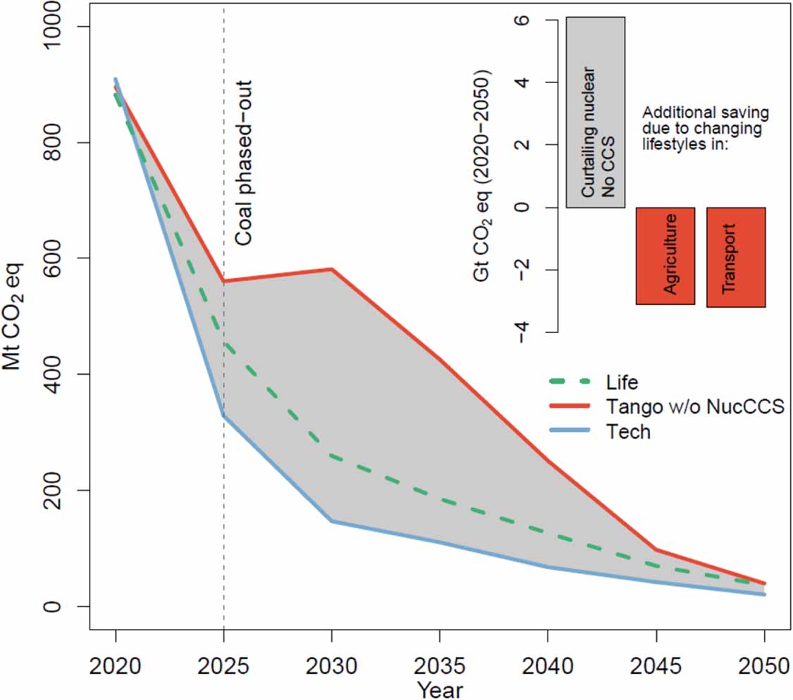 The GHG implications of Tango w/o NucCCS are visible in the sudden jump in 2030 as substantial share of nuclear production goes offline. The loss in production is then compensated by natural gas generation (see section 3 and figure 50 of the SI). As in Bauer et al (2012), decommissioning nuclear power might come at the expense of more emissions from the power sector, either because equivalent renewable capacities cannot be deployed within 5 years or as reserves to account for their intermittency. Between 2020 and 2050 this would imply an additional 6 Gt CO2eq compared to the Tech scenario in the EU27 + 2 (see grey area of figure 5 main and inset). However, it should be noted that the original Tango scenario accounts for all behavioural changes in the Life scenario and all ambitious technical improvements in the Tech scenario. These synergistic reductions in GHG emissions, attributable to lifestyles changes, result in cumulative savings of 3.1 and 3.2 Gt CO2eq in the agriculture and transport sectors respectively between 2020 and 2050 (see inset in figure 5). These emission savings would be enough to compensate the loss of abatement from nuclear power.