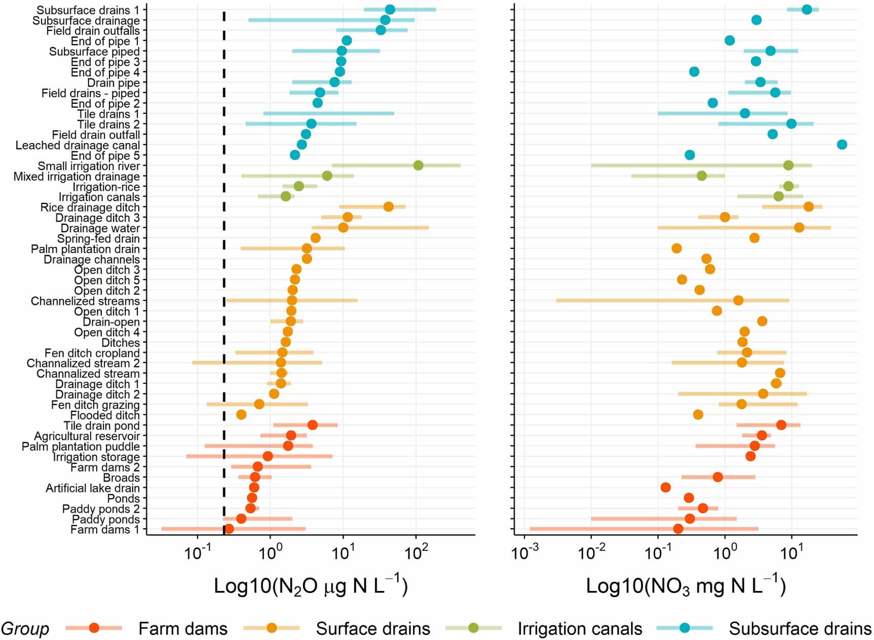 Figure 1. Summary of dissolved N2O and NO3 concentrations from studies compiled in this review on log10 scale. Dots represents means and lines represent range. Dashed line represents dissolved N2O concentration at atmospheric equilibrium.