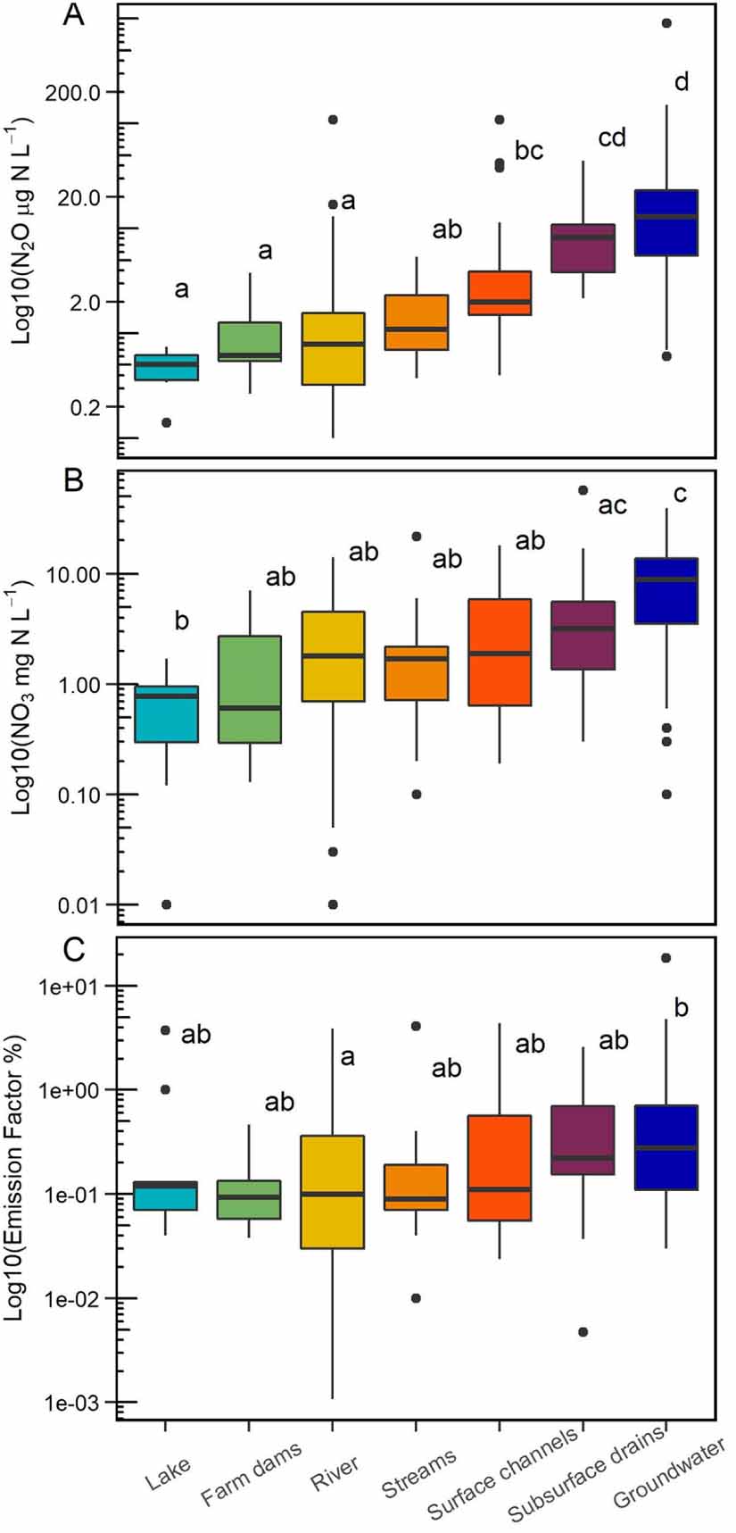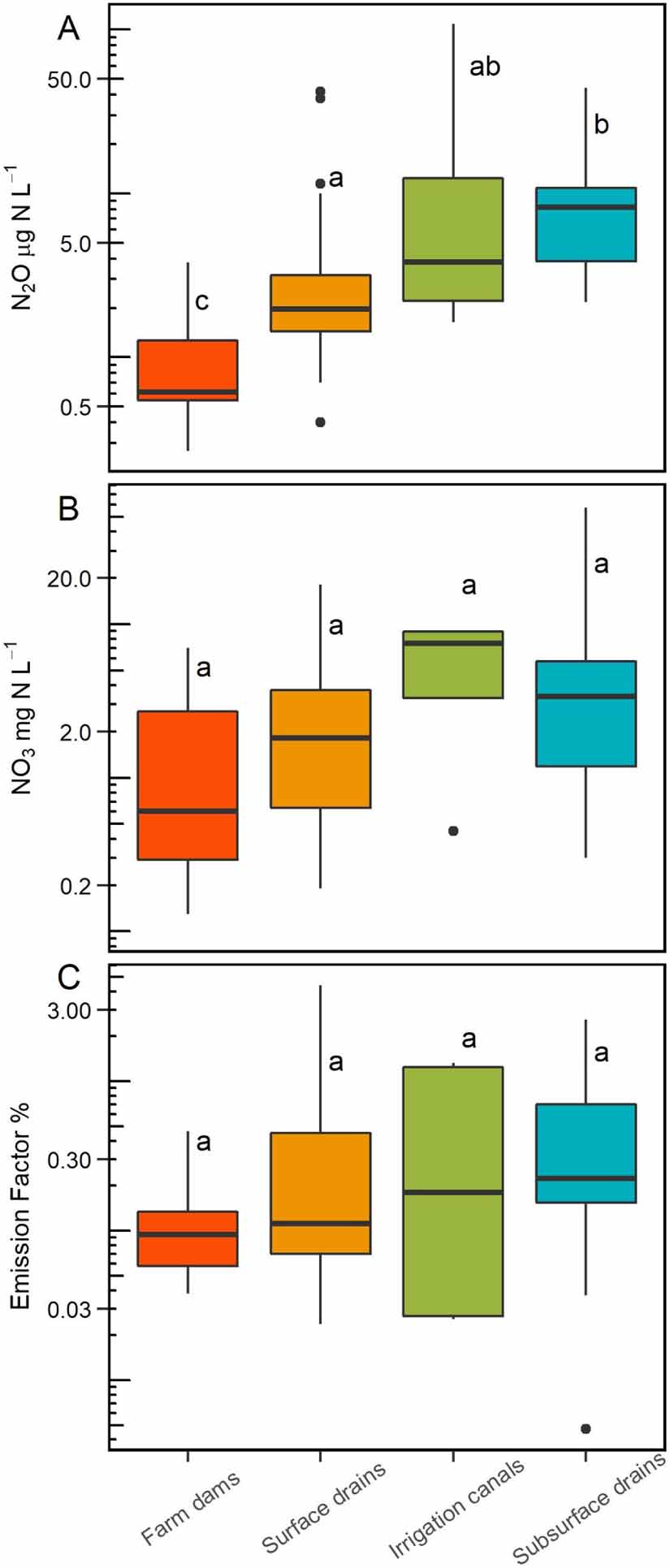 Figure 2. Variation of log10-transformed dissolved N2O concentration (µg N l−1), NO3 (mg N l−1) concentrations, and EFs (%) between artificial agricultural surface waters. Different letters represent significant differences (p < 0.05) among groups (one-way ANOVA and Tukey–Kramer post hoc test). Boxes span the interquartile range (25%–75% quartiles), whiskers 5%–95% of observations, horizontal line the median, and circle points represent outliers.