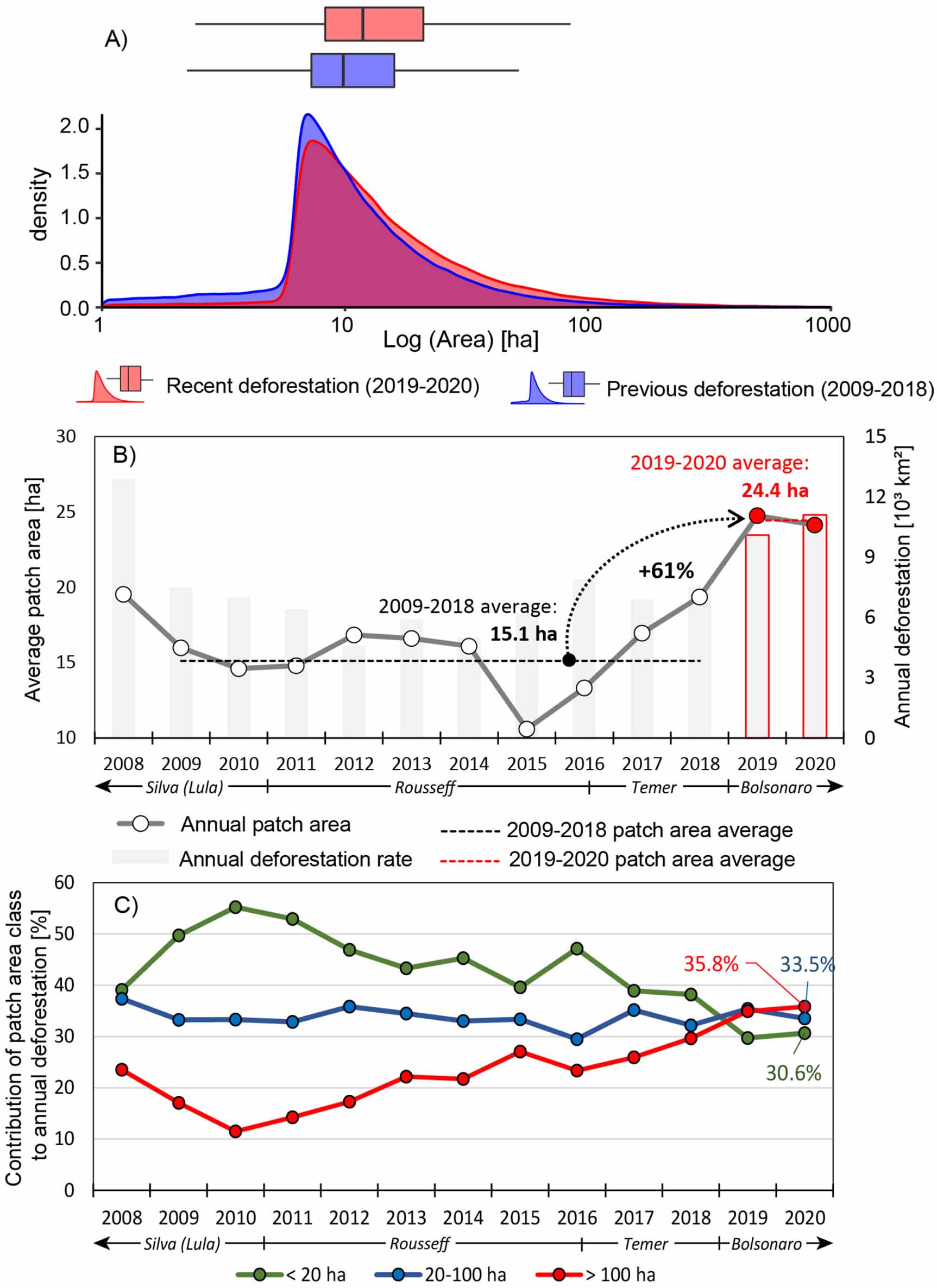 Figure 1. Changing deforestation pattern in the Brazilian Amazon from 2008 to 2020 and federal governance (data source: www.obt.inpe.br/OBT/assuntos/programas/amazonia/prodes). (A) Probability density curves and box-whiskers plots of deforestation patch size for recent (2019–2020) and previous (2009–2018) deforestation. Recent and previous distributions of deforestation patch area are significantly different (p < 0.001) following the Mann–Whitney–Wilcoxon test. (B) Averaged area of deforestation patch from 2008 to 2020 and annual deforestation. The dashed black line shows a ten year average for previous deforestation (2009–2018) and the dashed red line shows a two year average of recent deforestation (2019–2020). The dotted black arrow indicates a 61% increase in the recent deforestation patch area. Recent averaged patch area and annual deforestation are highlighted in red. (C) Changes in the contribution of deforestation patch area classes to annual deforestation from 2008 to 2020. Large patches (>100 ha) are increasing in their overall contribution to the annual deforestation and are now dominating total deforestation. The timeline under x-axis in panels (B) and (C) shows the presidents of Brazil and changes in political leadership over time.