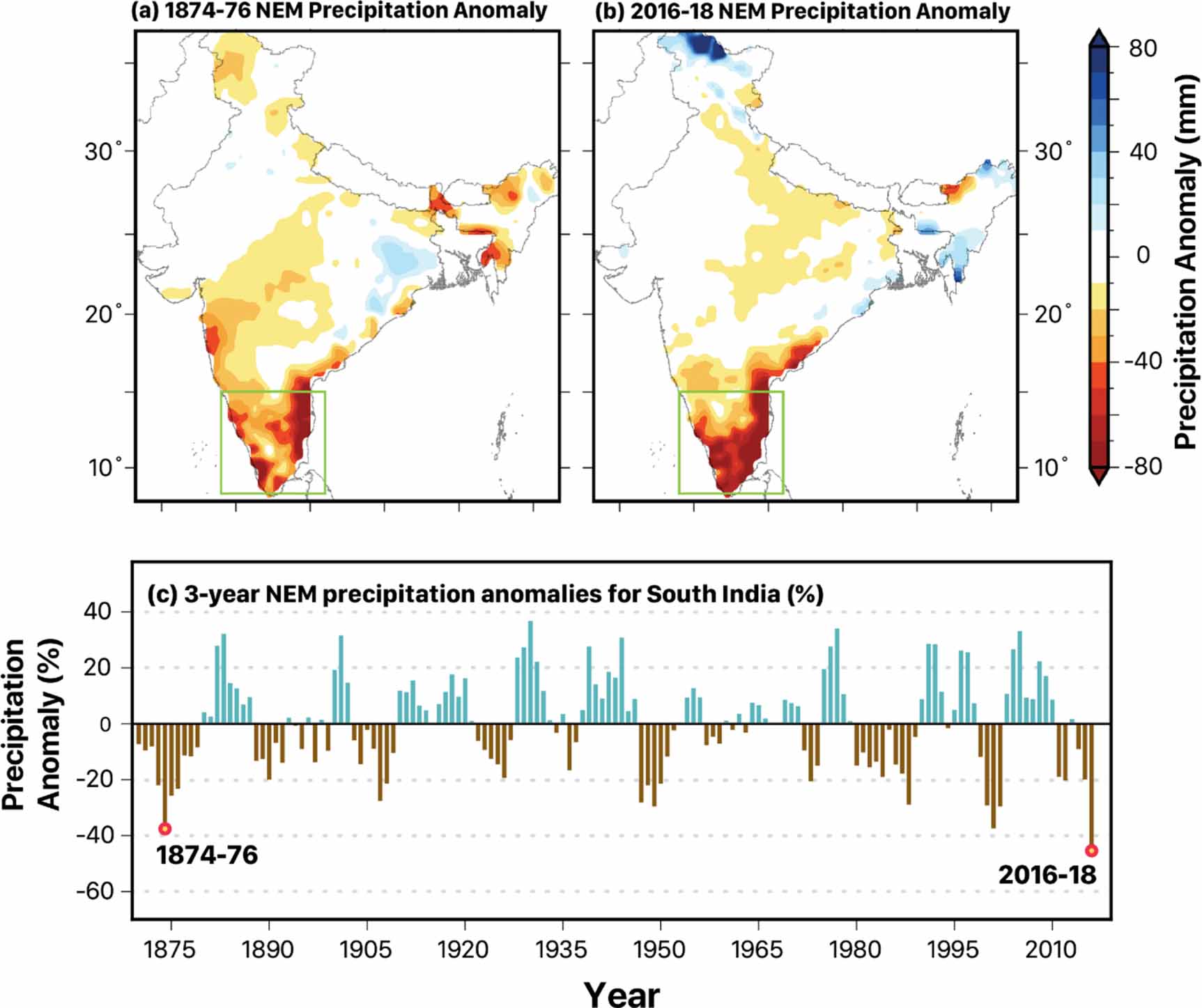 Figure 1. Three-year cumulative precipitation anomalies (mm) during the Northeast monsoon (NEM, October–December). (a), (b) The spatial pattern of 3 year cumulative precipitation anomalies (mm) during 1874–1876 and 2016–2018 periods, respectively, in southern India (denoted by the green box). (c) Area-averaged (over the green box) 3 year moving-mean precipitation anomalies (%) for the period 1870–2016. Red dots in (c) demarcate the two periods of interest, and show that the 2016–18 was the 1st and 1874–76 was the 2nd worst drought in last 150 years. Long-term precipitation data is based on station observations from the Indian Meteorological Department (IMD).