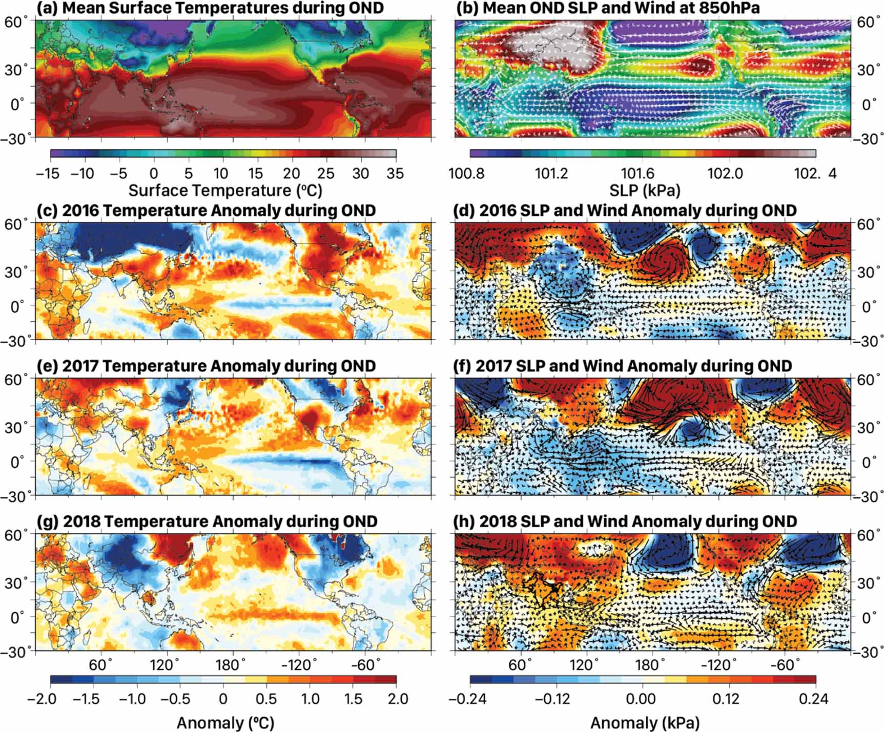 Figure 3. Atmospheric and oceanic patterns during the 2016–18 drought in South India. (a), (b) Climatological mean surface-air temperature (SAT, °C) and sea-surface temperature (SST, °C), mean sea-level pressure (SLP, Pa) and wind at 850 hPa (in (b)) during the October–December (OND) season. (c), (d) SST, SLP, and wind anomalies associated with the NEM during the OND season of 2016, (e), (f) 2017, and (g), (h) 2018. Mean SLP and wind fields were obtained from ERA-5 whereas SST was taken from HadSST and SAT from BEST.