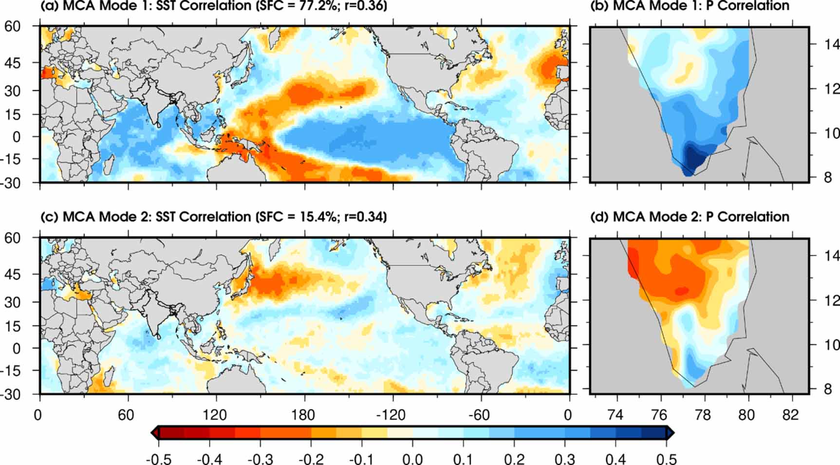 Figure 5. Links between South Indian precipitation and sea surface temperature (SST) during the Northeastern Monsoon season. (a), (b) Correlation patterns obtained from the first leading mode of maximum covariance analysis (MCA) performed between precipitation across South India (8°N–15°N and 74°E–81°E; see Green Box in figure 1) and SST during the October–November–December (OND) season over 1870–2018. (c), (d) Same as in the above panels but for the second leading mode of MCA. Rainfall was obtained from the IMD dataset whereas SST was retrieved from HadSST.