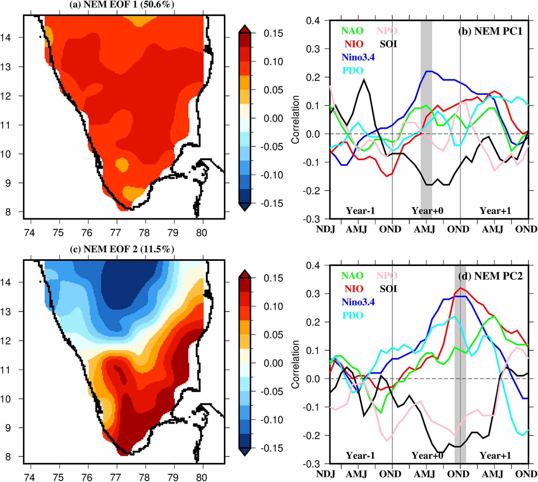 Figure 6. The leading modes obtained from the empirical orthogonal function (EOF) analysis of rainfall during the NEM for the 1870–2018 period. (a) The first leading EOF mode of NEM, which explains 50.6% of the total variance in NEM rainfall in South India. (b) Lagged correlation between the first leading principle component (PC 1) and 3-month mean SST anomalies over different regions (Nino 3.4 (5°S–5°N, 120–170°W), North Indian Ocean (NIO; 6°–24°N, 40–100°E), North Pacific Ocean (NPO; 30°N–50°N, 120°E–175°W), North Atlantic Ocean (NAO; 6°–24°N, 10–60°W), Pacific Decadal Oscillation (PDO), and Southern Oscillation Index (SOI)). (c) and (d) same as (a) and (b) but for the second leading EOF mode and the corresponding PC 2. Year − 1, Year + 0, and Year + 1 represent the previous, current, and next year of the NEM season, respectively.