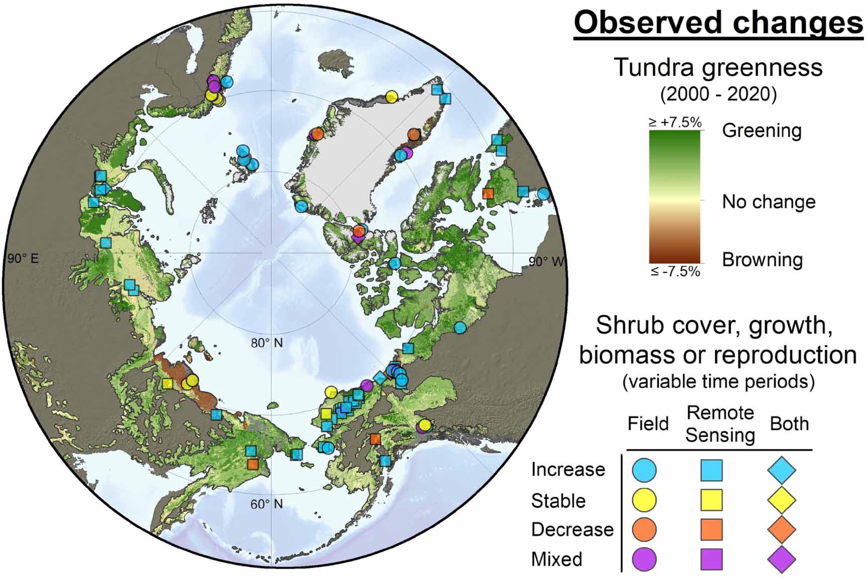 Figure 2. Observed changes in tundra greenness and shrub dynamics across the Arctic tundra biome. Changes in tundra greenness are based on trends in maximum summer NDVI (NDVImax) from 2000 to 2020 derived from Landsat satellite observations. Specifically, the map shows the percent change in mean NDVImax among sampling sites (n = 41 341) stratified by ecological land units (n = 186) with similar vegetation, soil, and climate. The trend map was modified and updated from Berner et al (2020). Observed changes in shrub cover, growth, biomass, and reproduction were based on a systematic literature review updated from García Criado et al (2020). Observed changes in shrub dynamics were based on field data (e.g. ecological monitoring, dendroecology), high-resolution remote sensing data (e.g. repeat photography, aerial photos), or both. Sites with mixed shrub dynamics typically had some species or species groups that were stable along with others that increased. Note that individual studies assessed changes in shrub dynamics during different time periods that do not fully overlap with observed changes in tundra greenness derived using the Landsat satellites. Background topographic data is from NOAA. Adapted by permission from Springer Nature Customer Service Centre GmbH: Springer Nature, Nature Communications, Summer warming explains widespread but not uniform greening in the Arctic tundra biome, Berner et al, Copyright © 2020, The Author(s). CC BY 4.0.