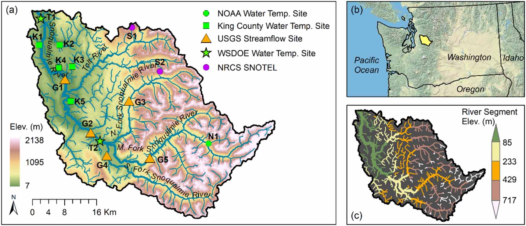 We obtained in situ streamflow, snow, and stream temperature data from multiple agencies across the basin for model calibration and validation (figure 1(a)). Specifically, daily snow water equivalent (SWE) data were acquired from two Natural Resources Conservation Service Snow Telemetry (SNOTEL) stations (S1, S2 ) within the basin. The SWE data (1994–2013) were quality controlled and bias corrected for snowfall undercatch following the approaches outlined in Yan et al (2018) and Sun et al (2019). Daily streamflows (1992–2013) were acquired from five US Geological Survey (USGS) flow gauges (G1–G5); stream temperatures were obtained from Washington State Department of Ecology (WSDOE, T1, T2), King County (K1–K5), and National Oceanic and Atmospheric Administration (NOAA, N1). These datasets are distributed across the basin from tributaries to the mainstem. Two WSDOE sites on the mainstem provided daily stream temperature in summertime during 2002 and 2010. Five King County sites were located in the tributaries in the lower SRB and provided continuous daily stream temperature with different start dates from 2000 to 2009. The NOAA site, located in the alpine area and sensitive to snowmelt effects, provided 30 min stream temperature since 2011.