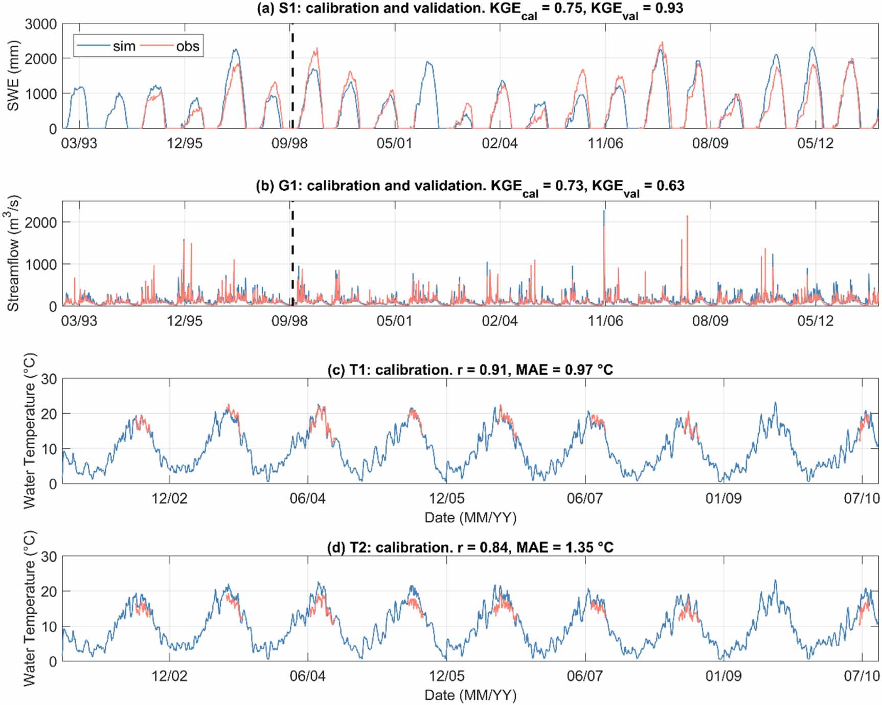 Figure 2. DHSVM-RBM calibration and validation results for selected snow, streamflow, and water temperature sites as examples. Model simulated snow and streamflow were evaluated by the KGE, and stream temperatures simulations were evaluated by the MAE and the Pearson correlation coefficient (r). Black dashed lines in (a) and (b) divide the calibration (left) and validation (right) periods.