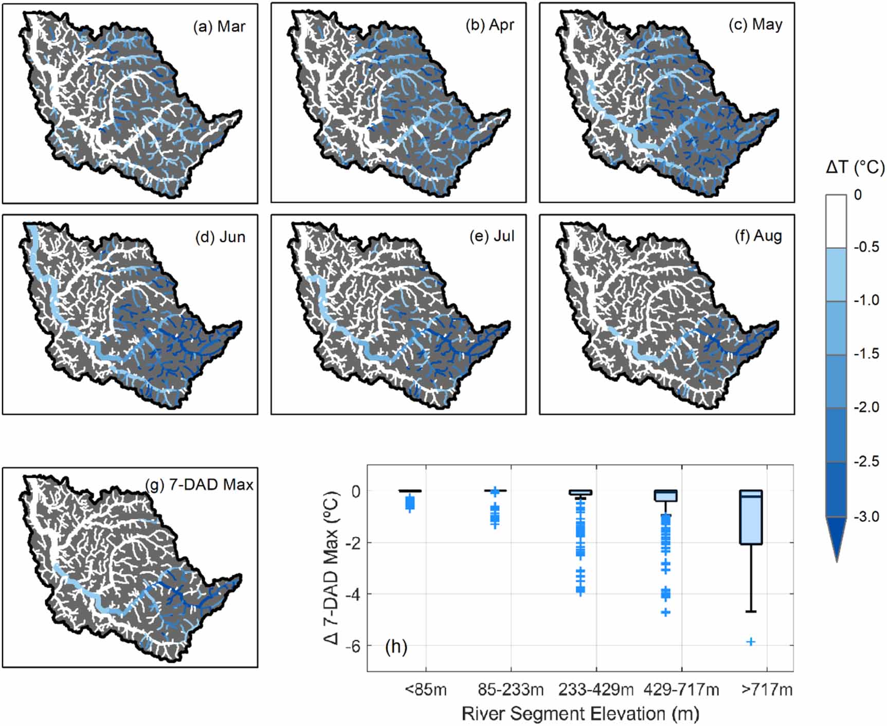 Figure 4. (a)–(f) Monthly mean stream temperature changes between two simulations (with snowmelt minus without snowmelt) from March to August over 2001–2013. (g) Changes of basin-wide 7-DADMax between two simulations, and (h) boxplots of basin-wide changes of 7-DADMax grouped by the five elevation bands shown in figure 1(c).