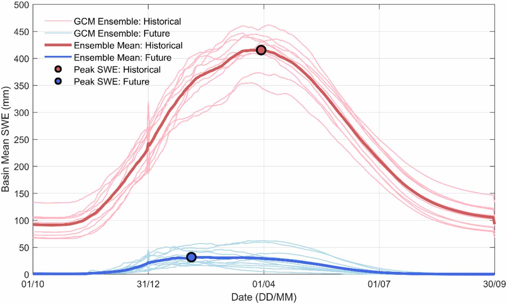 Standard image High-resolution imageFigure 6. Ten GCMs (thin line) and ensemble mean (thick line) of basin mean SWE over historical (1993–2005) and future (2087–2099) periods under RCP8.5 scenario. Dots indicate ensemble mean annual peak SWE date for both historical (30th March) and future (3rd February) periods.