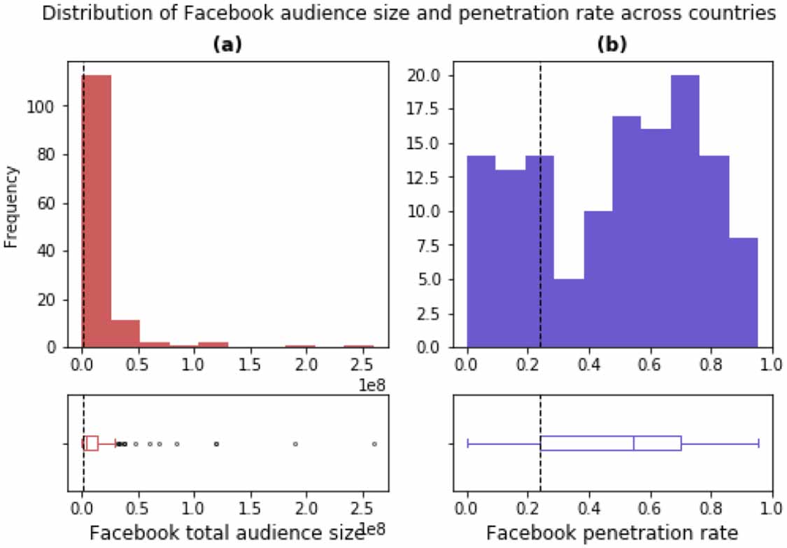Figure 1. Distribution of (a) Facebook total audience size (b) penetration rate across 131 countries. Upper panels show the distribution in histograms, while the lower panels show the boxplots that mark 25th, 50th, and 75th percentiles. Whiskers of the boxplots mark the 1.5× of the interquartile range, and the outliers are shown with dots. Dashed vertical lines mark the 25th percentiles.
