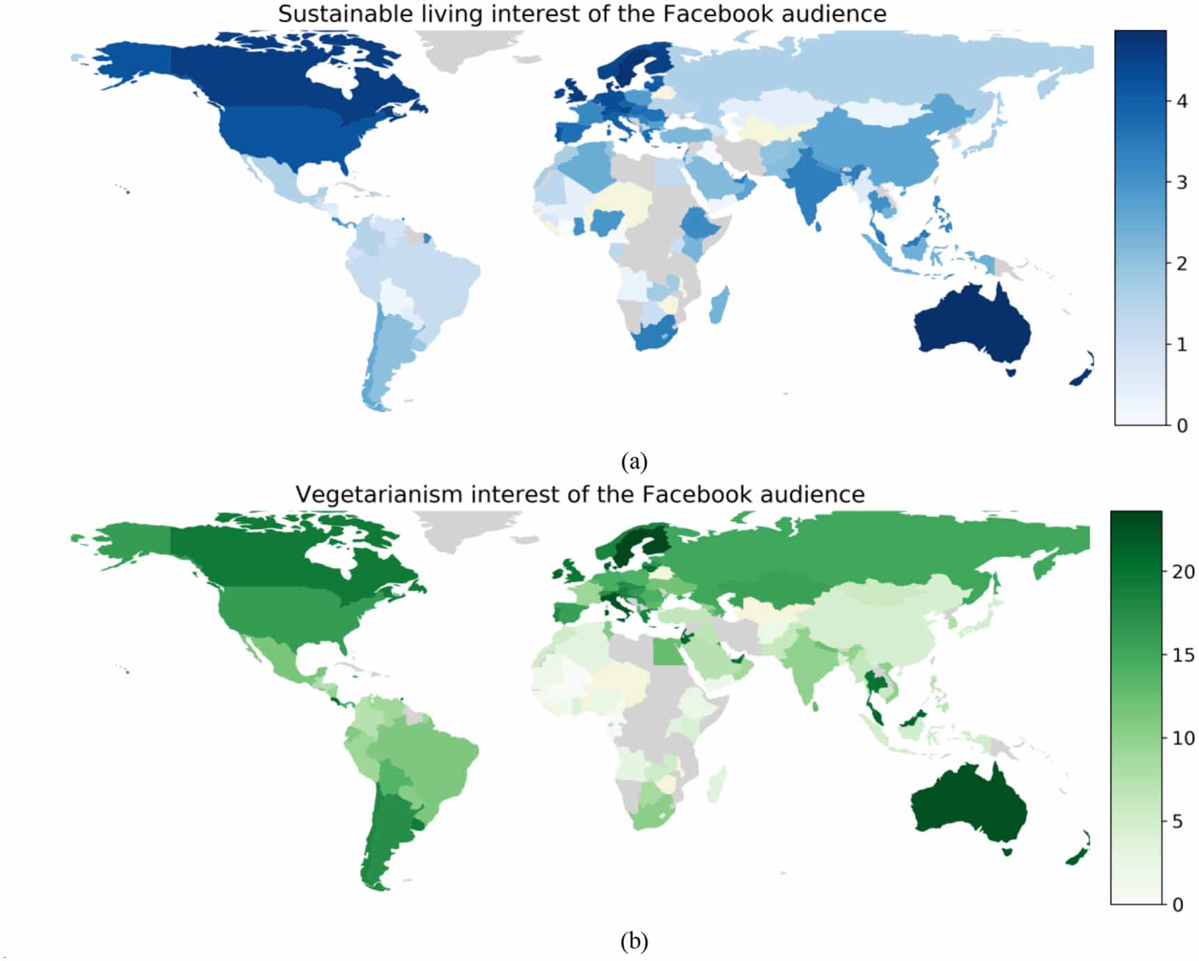 Standard image High-resolution imageFigure 2. Fraction of the Facebook audience in 115 countries interested in (a) sustainable living (b) vegetarianism: the colour codes refer to the audience percentage interested in the two keywords as shown on the colour bars. The countries for which there is no data are coloured in grey, and the 16 countries which are left out due to low Facebook penetration are coloured in beige. An interactive version of this map and its underlying data, also including the available surveys and Google Trends interest, can be seen on https://bit.ly/3aOi8ZN.