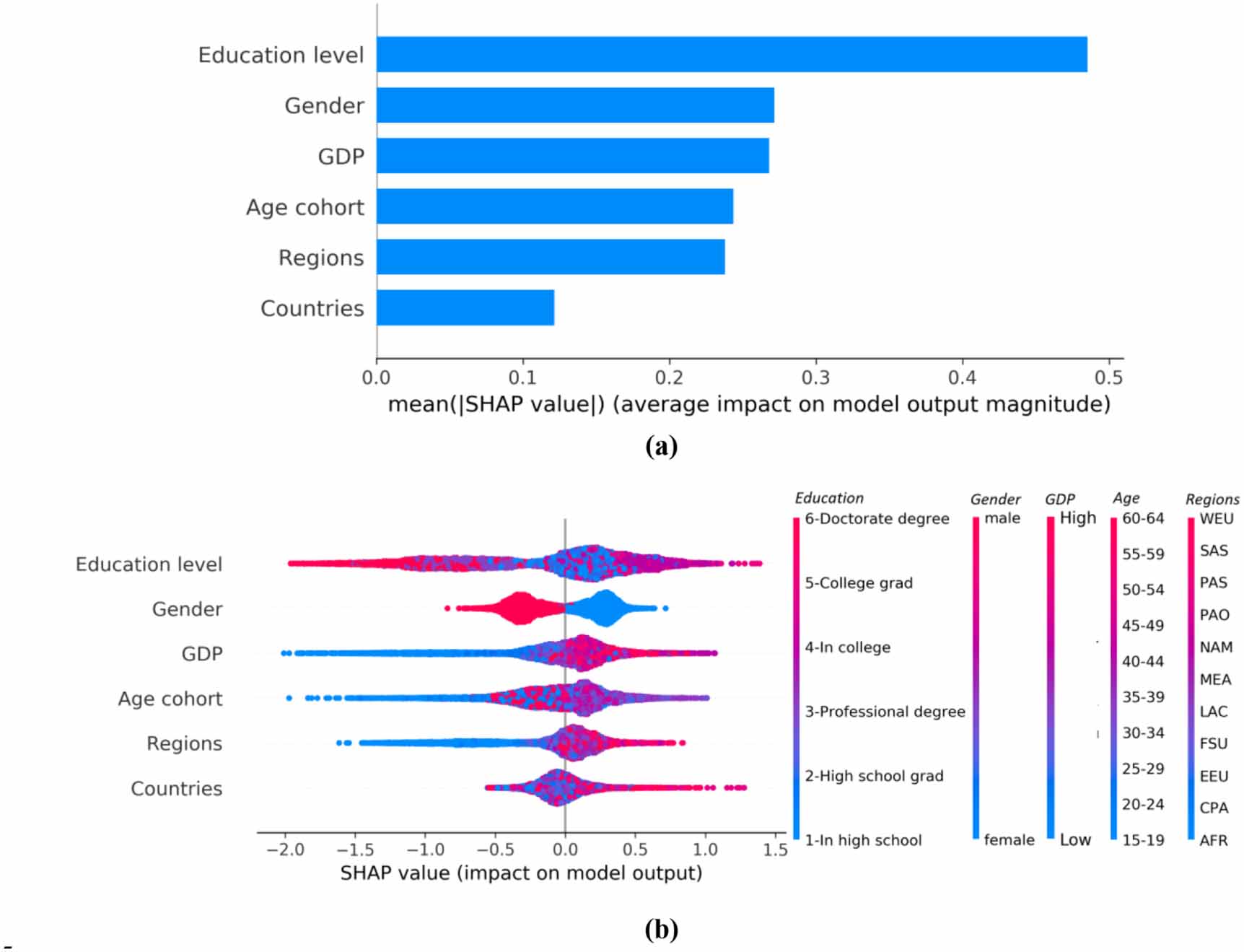 Figure 5. Relative importance of demographic factors for explaining the Facebook audience fraction interested in vegetarianism. (a) Mean absolute shapley additive explanation (SHAP) values estimated based on a regression tree model fit to the Facebook audience size data. (b) Individual SHAP values showing the distribution of the impacts of each demographic factor (feature) on the model output. The higher the SHAP value of a factor, the higher the vegetarianism interest. In (b), each dot refers to a data point, which is a demographic group defined by age cohort, gender, country and education level. The data points are stacked vertically to show the density, and coloured according to the feature value. For education level and age cohort, red points refer to higher education levels and older ages, respectively, whereas the blue is for lower education and younger age cohorts. For gender, red refers to males and blue refers to females. For countries, the countries that are last in the alphabetic order are marked with red. Similarly red-blue colour scale for GDP refers to the high-low spectrum. The 11 regions are shown on an additional colour bar on panel (b). See section 2 for the definition of regions. The figure is created using the Python package shap [47].