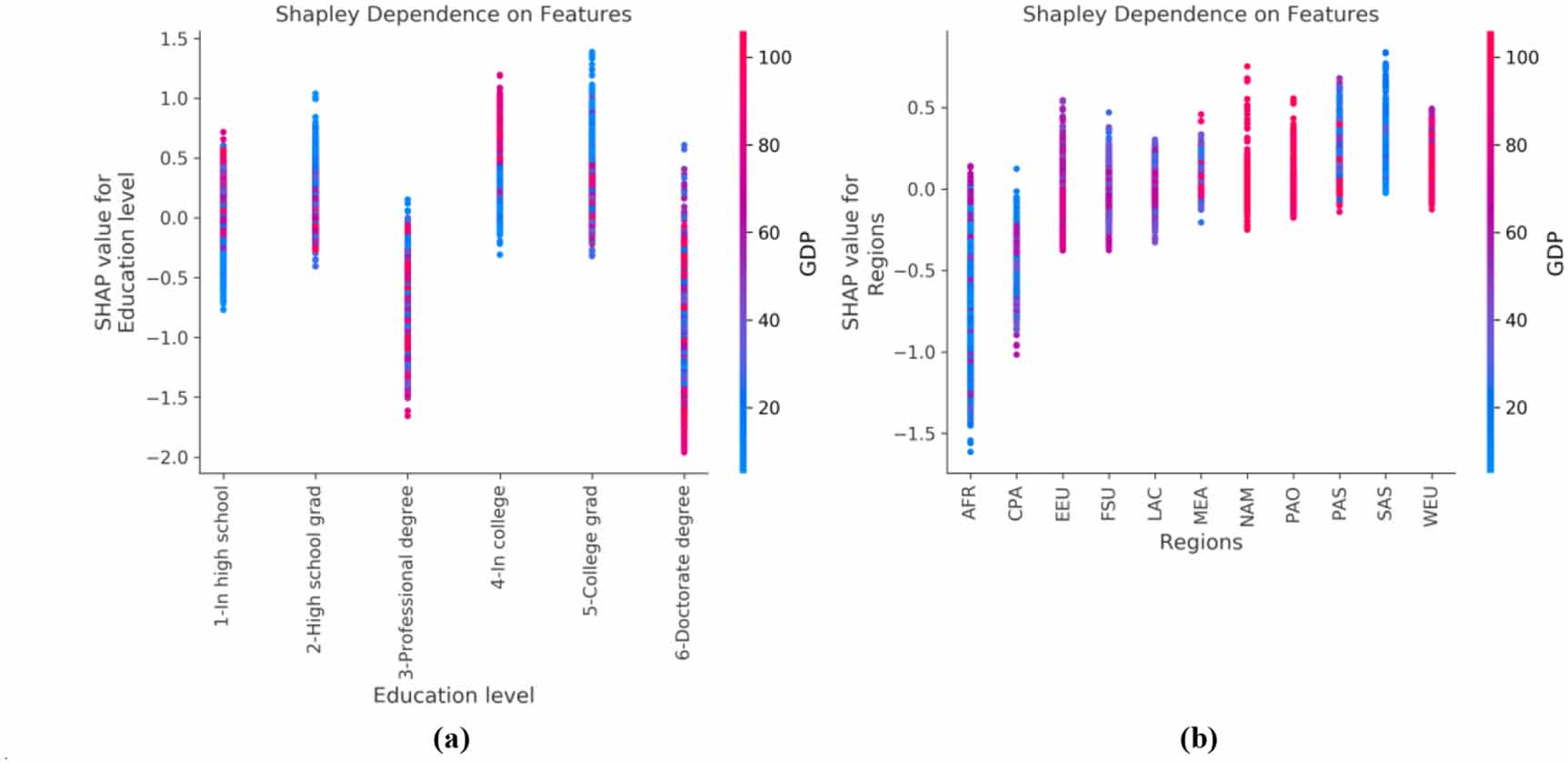 Standard image High-resolution imageFigure 6. Shapley dependence plots (a) Impact of education level on Facebook vegetarianism interest depending on country's GDP per capita. The figure shows the individual SHAP values for each education level, coloured according to GDP per capita. (b) Impact of geographic region on Facebook vegetarianism interest depending on countries' GDP per capita. Individual SHAP values for each region coloured according to GDP per capita. These two plots can be considered as the first and 5th rows of figure 5(b) rotated and divided into their distinct values. The figure is created using the Python package shap [47].