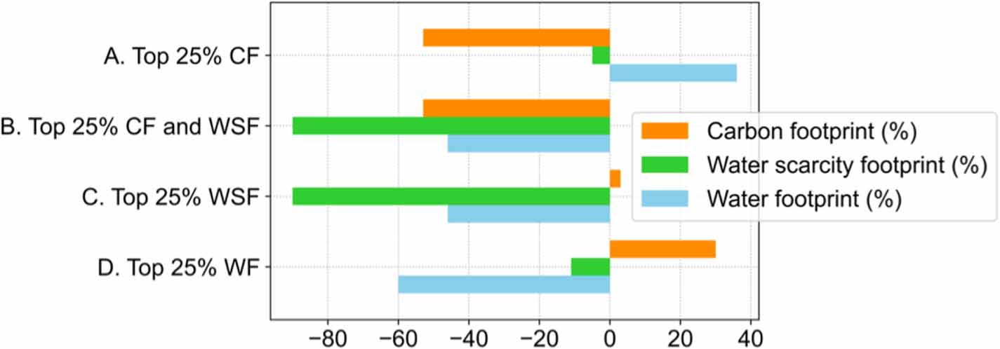 Figure 6. Percent change in environmental footprints associated with new data center servers compared to the 'business-as-usual' scenario. While the business-as-usual scenario assumes new servers will be placed in proportion to historical server locations, alternative scenarios explicitly consider the environmental implications of data center placement. Scenario A places data center servers in subbasins within the top quartile of all subbasins in environmental performance for both carbon (CF) and water scarcity (WSF) footprints. Scenario B represents server placement within subbasins in the top quartile for carbon footprints, while scenario C and D represent the best (top 25%) subbasins to place data center servers with respect to minimizing WSFs and water footprints (WF), respectively.